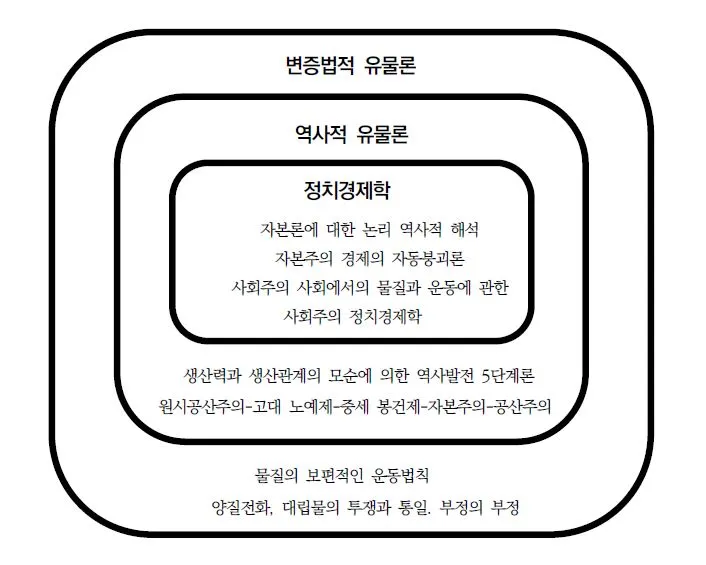 ‘정치경제학 비판’ 서문에서는 다음과 같이 이야기하고 있다. 인간은 사회적 생산에서 필연적이며 마음대로 할 수 없는 관계들을 받아들인다. 물질적 생산력의 일정 발전 단계에 대응한는 생산관계를 가진다. 생산 관계들의 총체가 사회의 경제적 구조를 형성한다. 이를 실질적 토대로 하여 법적 정치적 상부 구조와 일정한 사회적 의식 형태가 대응한다. 물질적 생활의 생산방식은 사회적, 정치적 그리고 정신적 생활과정 일반을 제약한다. 인간의 의식이 그 존재를 규정하는 것이 아니라 반대로 인간의 사회적 존재가 그 의식을 규정한다. 경제적 토대의 변화와 더불어 거대한 상부구조 전체도 조만간 변혁된다.