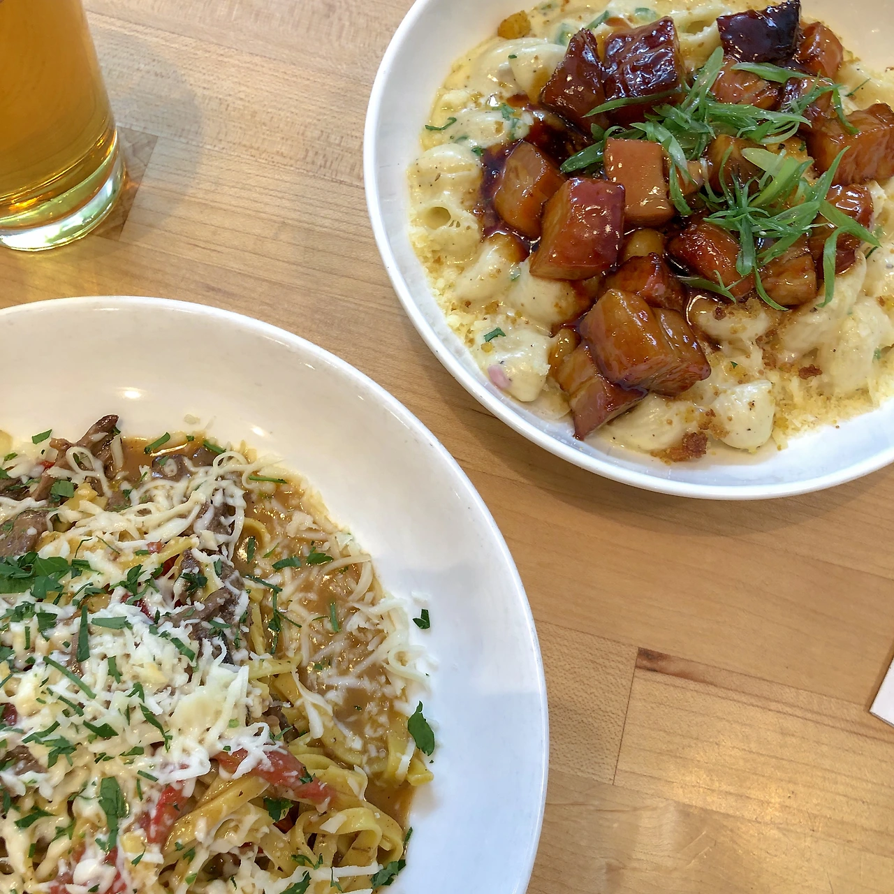 여기서 가장 유명한 메뉴인 포크밸리 맥앤치즈와 파스타 하나를 시켰다. 그리고 이 가게의 이름이 들어간 맥주를 시켰다. 잘 모르는 식당에 가면 메뉴판 첫 번째에 있는 음식을 시키면 평타는 친다-가 나의 먹생 철학이다.