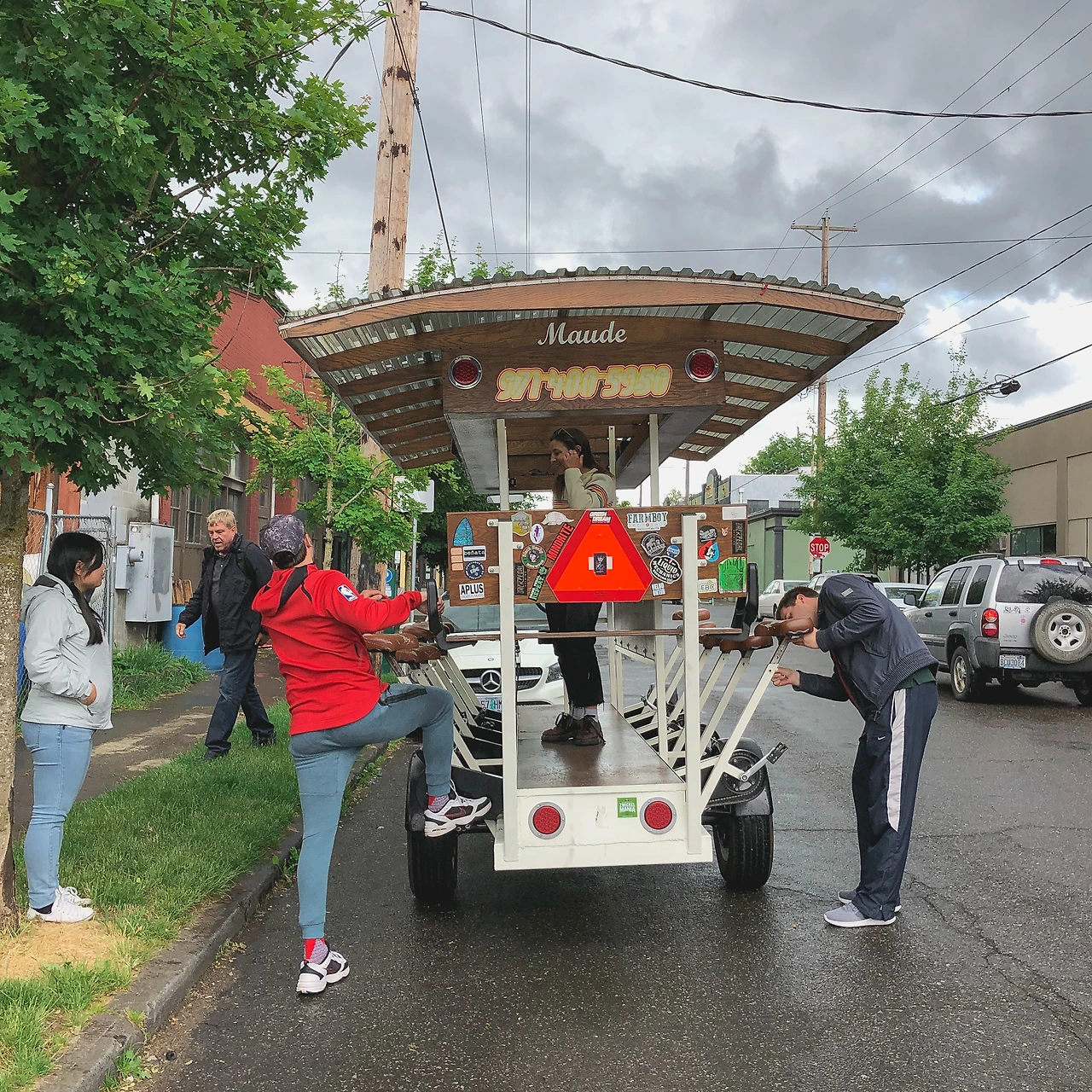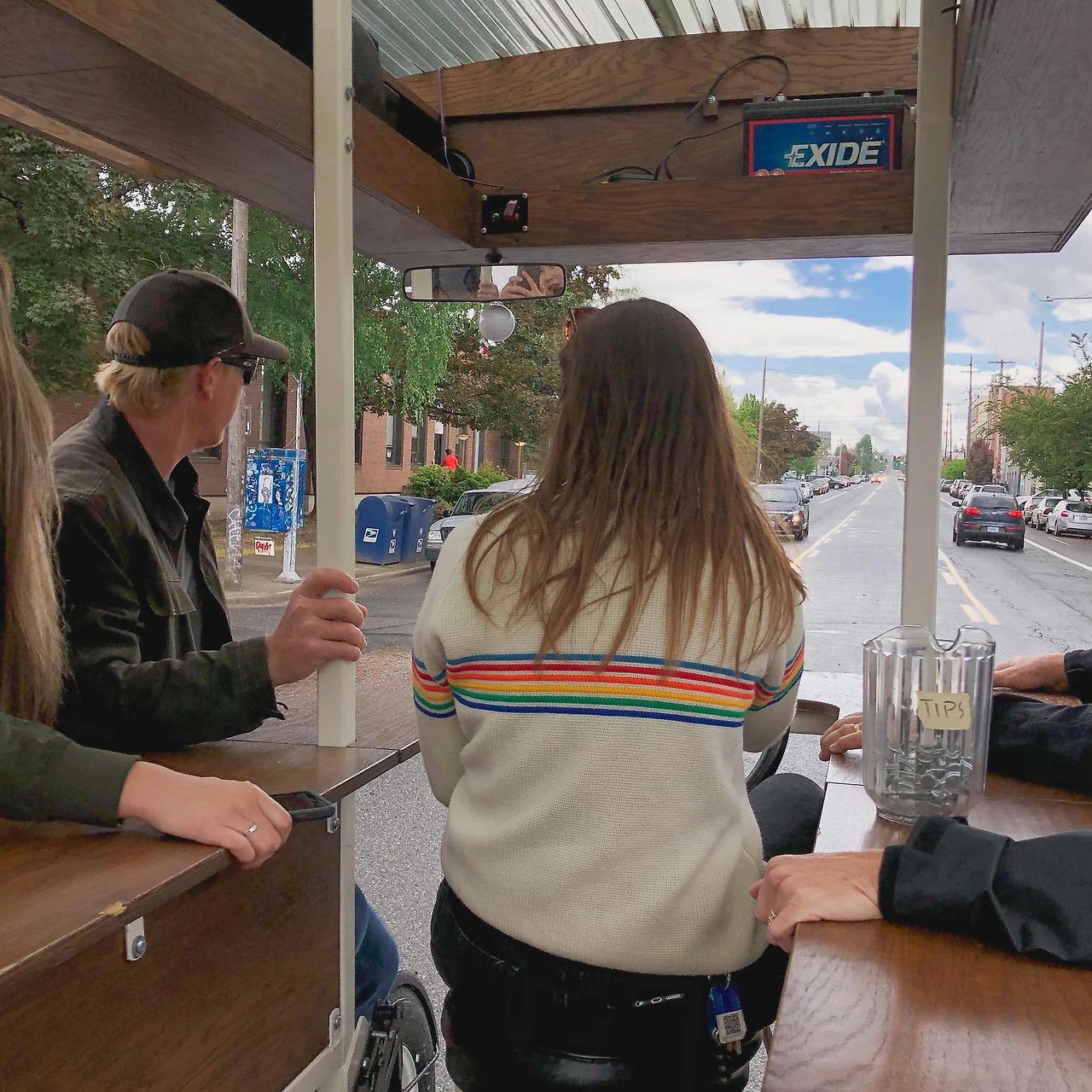 포틀랜드에서 자전거를 타려면 방향 전환을 할 때마다 손을 들어야 하는 게 매너라고 한다. Brew Cycle을 타는 라이더들도 예외는 아니었다. 우리가 탄 자전거(?)는 좀 요란하게 생기긴 했지만, 좌회전을 할 때면 왼쪽에 있는 사람들이, 우회전을 하면 오른쪽에 있는 사람들이 손을 들어 뒷 차에게 방향을 표시했다. 뻘쭘하게 손을 들던 사람들이 몇 명 있었는데(물론 나 포함), 나중에는 취기를 빌려 마스터가 시키지도 않아도 환호성을 지르며 너도나도 손을 들었다(물론 나 포함).