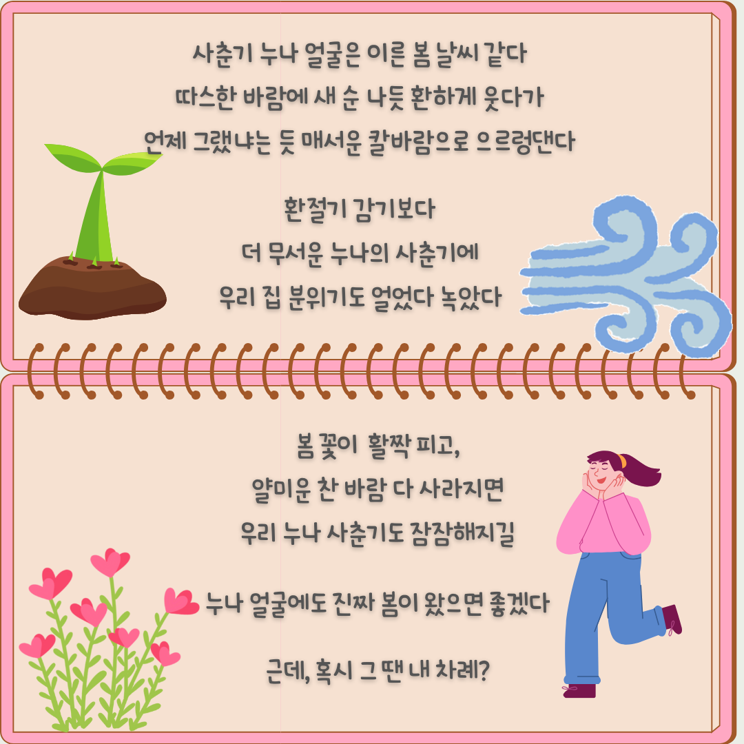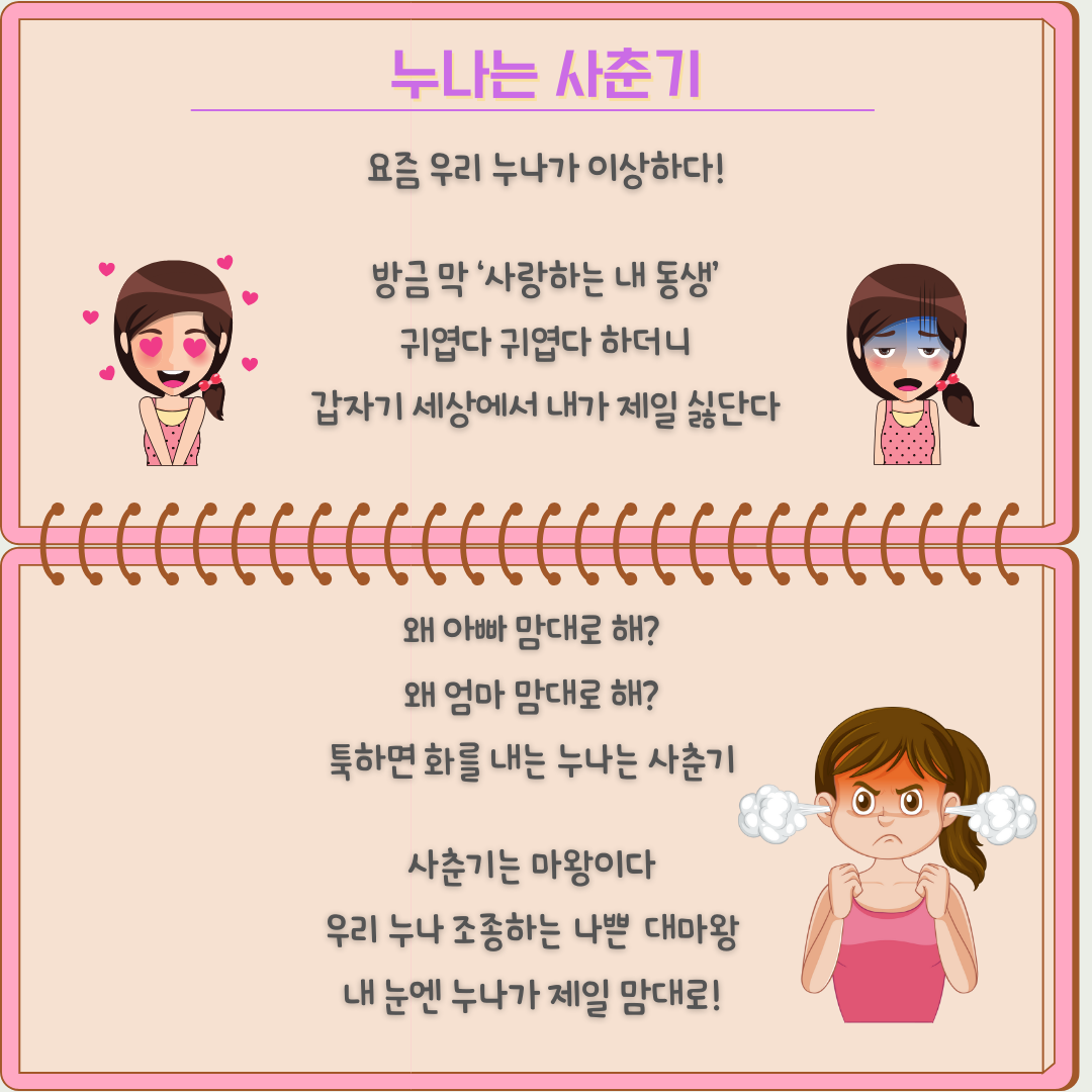 아~ 더 길어지면 딸을 너무 디스 할 것 같아서 이만 줄여야겠다. 그렇다고 딸이 매 순간 저렇게 밉게 행동하는 건 아니다. 여전히 내 이쁜 딸의 모습을 보일 때가 있다. 재밌게 읽은 책의 내용을 조잘거리고, 맛있는 음식을 함께 나눠 먹고, 안아달라며 애교를 부리며 안겨오곤 한다. 뭐 가끔 이상한 맥락에서 애교를 부려 도대체 얘 머릿속엔 뭐가 들었을까 싶을 때도 있지만 말이다.