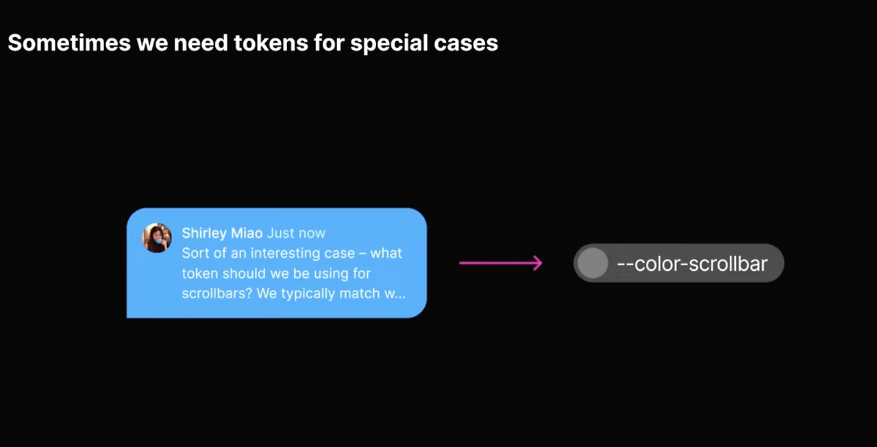 정말 어려웠던 케이스는 바로 특정 케이스에서 토큰이 없었던 경우인데, 다시 돌아가서 토큰 정의를 해야 하는 경우였다. 예를 들어 scroll bar color 같은 경우가 있었는데 우리의 스키마에 포함되진 않는 특수 케이스의 시멘틱 토큰 정의가 필요하단 것을 알 수 있었다.