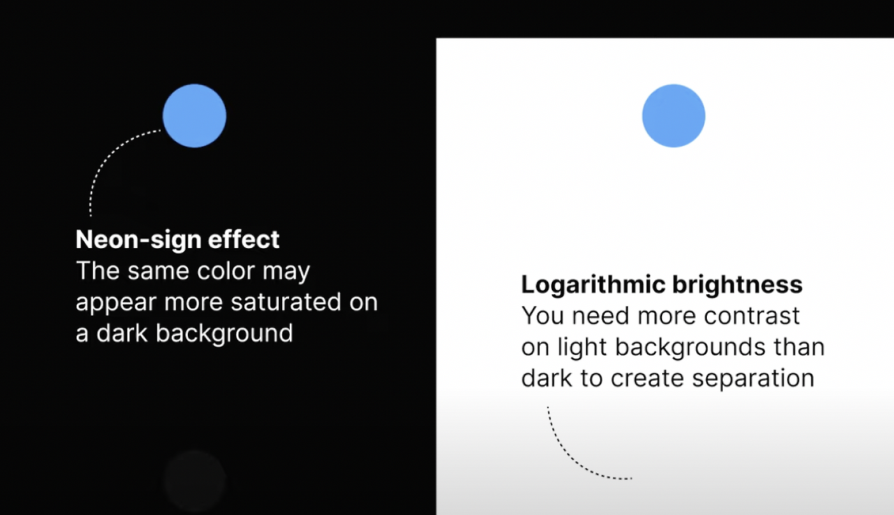 즉, 컬러 대비 또한 동일한 hue의 컬러라고 하더래도 라이트 모드와 다크 모드에서의 시각적 대비가 다르기 때문에 사용자가 느끼는 맥락이 다르다는 것이다.