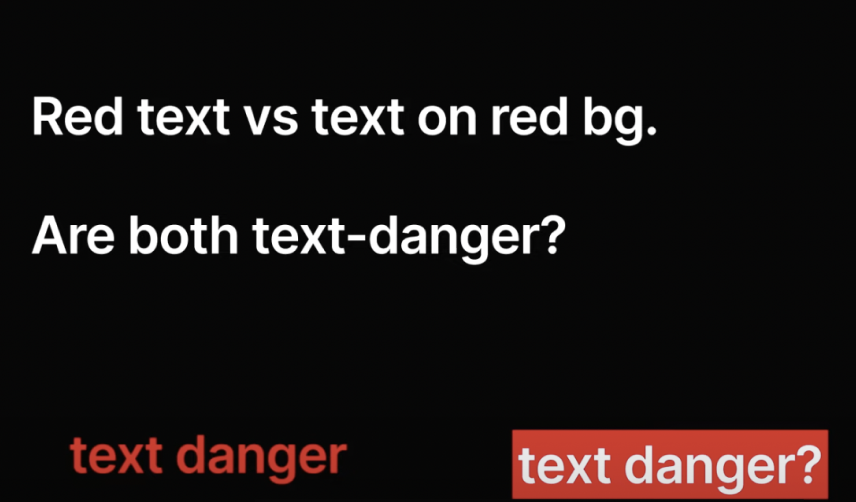 이를 두 개 다 ‘text-danger’로 정의할 것인가? 단편적으로 두 경우 모두 ‘text-danger’ 표현한다면 실제로 두번째 경우는 텍스트 컬러 흰 색이기에 이렇게 단편적으로 상황을 보고 네이밍을 만들게 되면 엣지 케이스가 계속해서 발생할 수 있다.