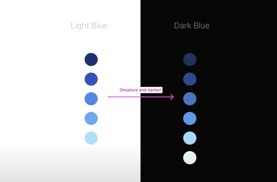 대부분의 사람들은 다크모드 만들자! 하면 가장 기본적인 접근으로는 hue를 다크 모드에 맞게끔 전환하고, 그렇게 컬러를 변경하는 것이다. (이게 젤 쉬운 방식이니까)
