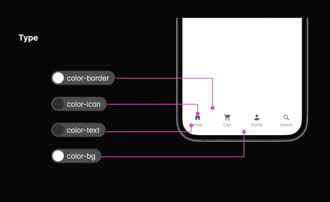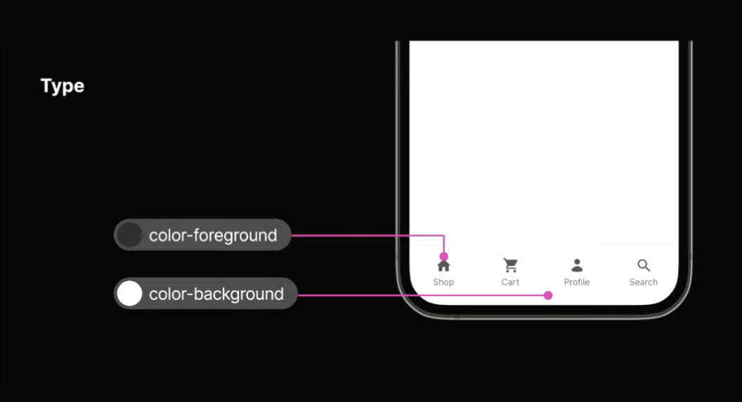예시로 해당 이미지에서의 내비게이션 바는 앞에 있는 요소(아이콘, 텍스트 등)들과 뒤에 있는 요소(배경색 등)으로 컬러를 나눌 수 있어 ‘color-foreground’, ‘color-background’로 나눴다.