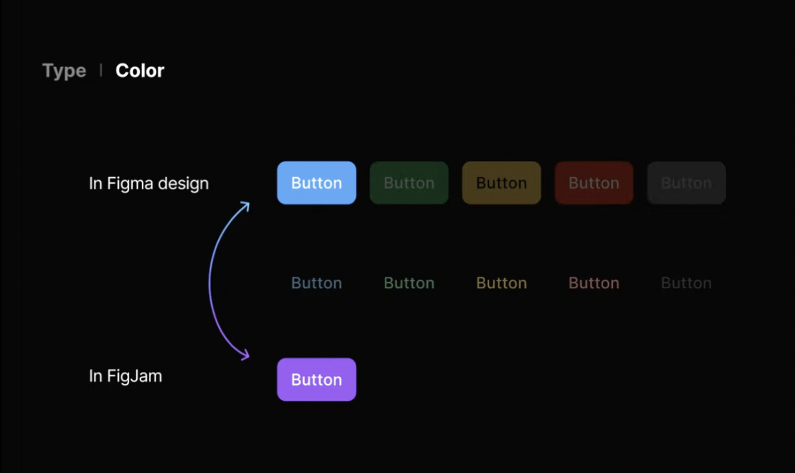 쉬운 예로 들자면, 이 파랑 버튼이 Figma에서는 파랑 버튼으로 보이지만, FigJam에서는 보라색 버튼으로 보이고 있다.