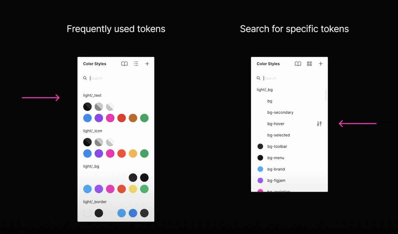 우린 또한 컬러를 찾을 때의 사용성도 생각했는데 디자이너가 모든 컬러 토큰을 알 필요는 없기에 가장 많이 사용되는 토큰을 위에서 찾을 수 있도록 했다.