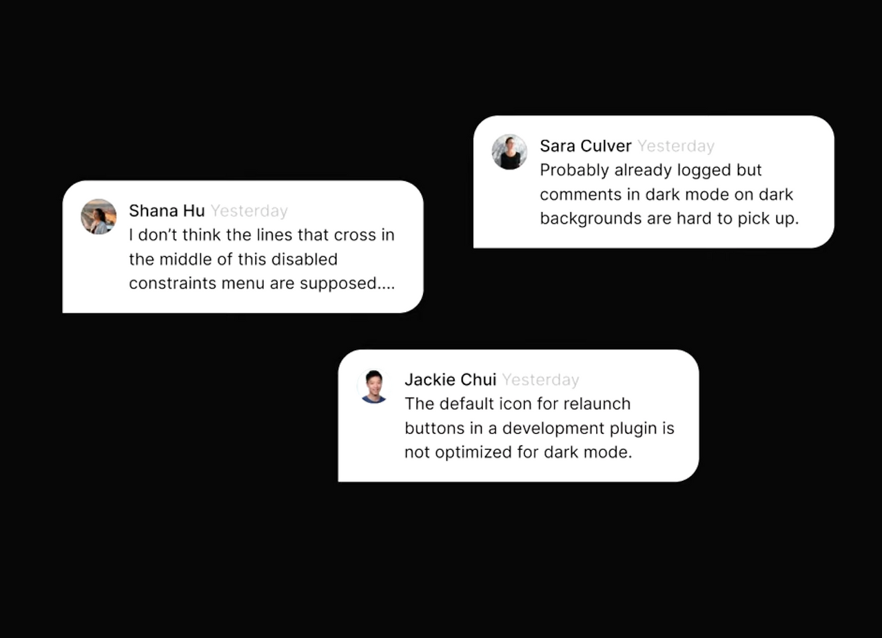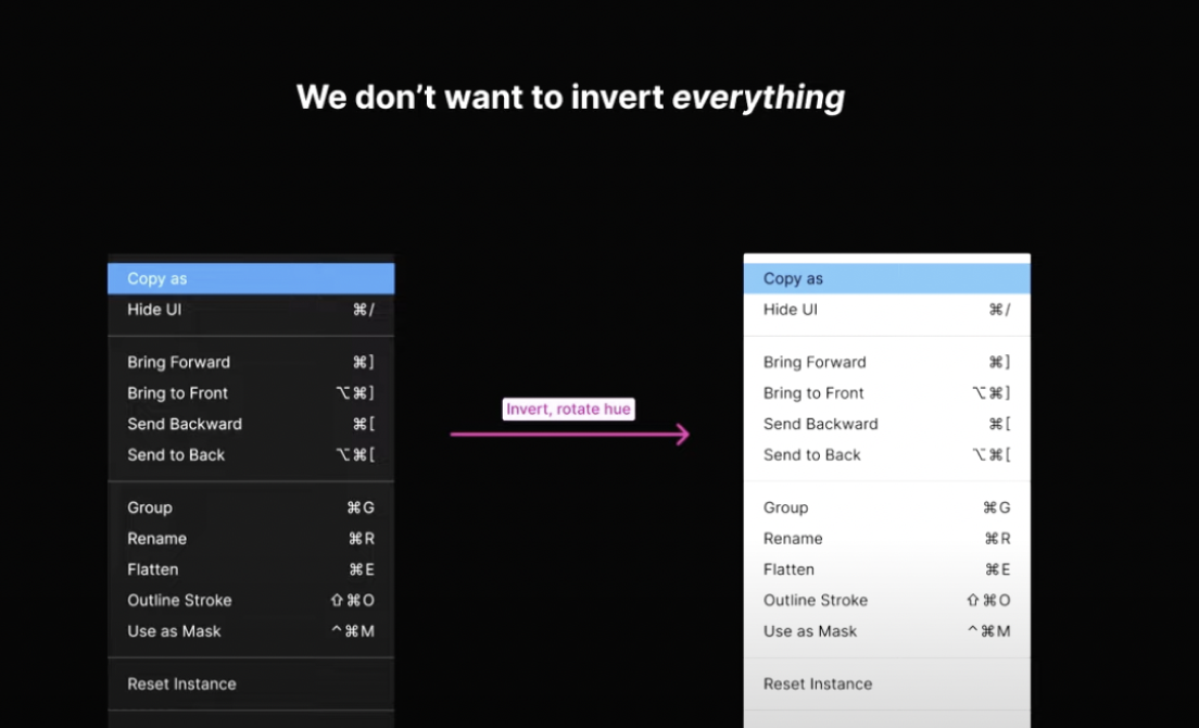 또 다른 문제점으로는, Figma에서 내비게이션 영역은 더 빠른 메뉴를 탐색하기 위해 다크 모드로 남아있길 바랐는데 단순히 hue rotate(색상 전환)로 모드를 바꿀 수 있는 영역과 그러지 않은 영역에 있어서의 구분이 애매모호하다는 것.