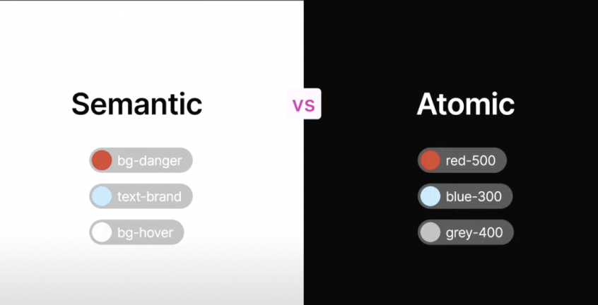 방식이 있는데 두 개의 차이는 Atomic 방식이란 ‘red-600’, ‘gray-100’처럼 컬러의 hue와 shade, 즉 컬러 그 자체를 이름에 표기하는 것이고, Semantic 방식이란 ‘bg-danger’, ‘text-brand’처럼 그 컬러가 사용되는 상황을 이름에 표기하는 방식이다.