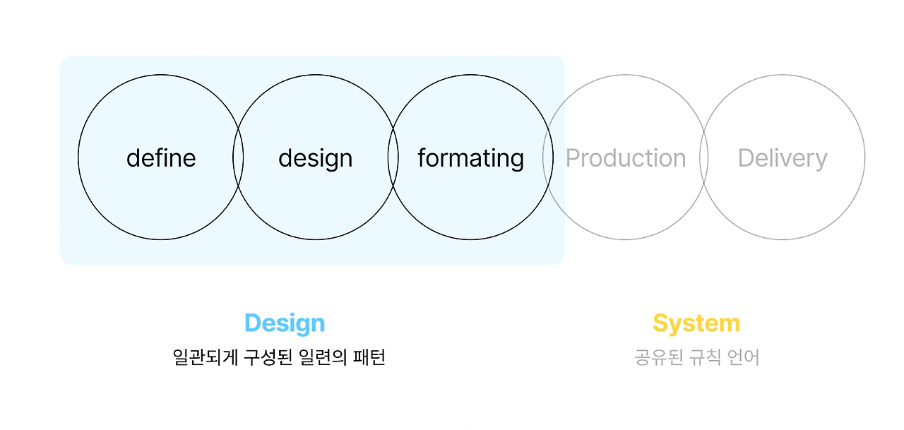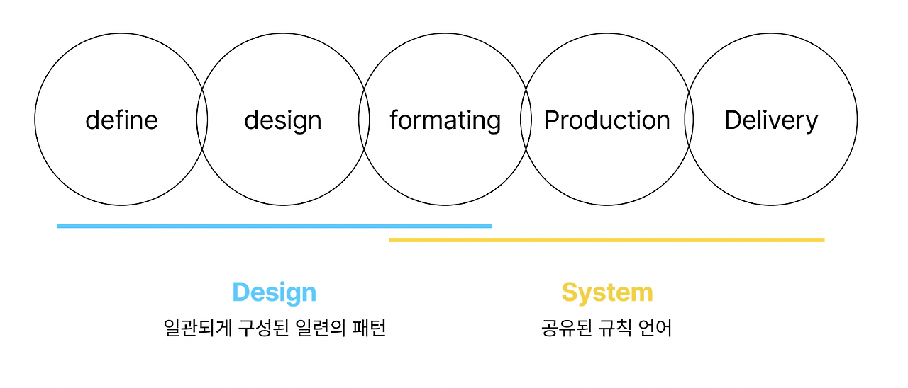 여기서 우리가 앞에서 얘기했던 design과 system으로 분리해 프로세스를 나눈다고 했을 때 앞의 세 단계가 디자인을 만드는 단계, 그리고 뒤의 세 단계가 시스템을 만드는 단계로 정의할 수 있겠습니다.