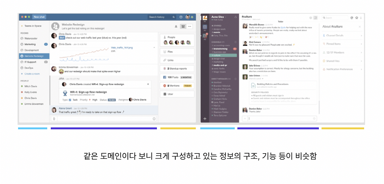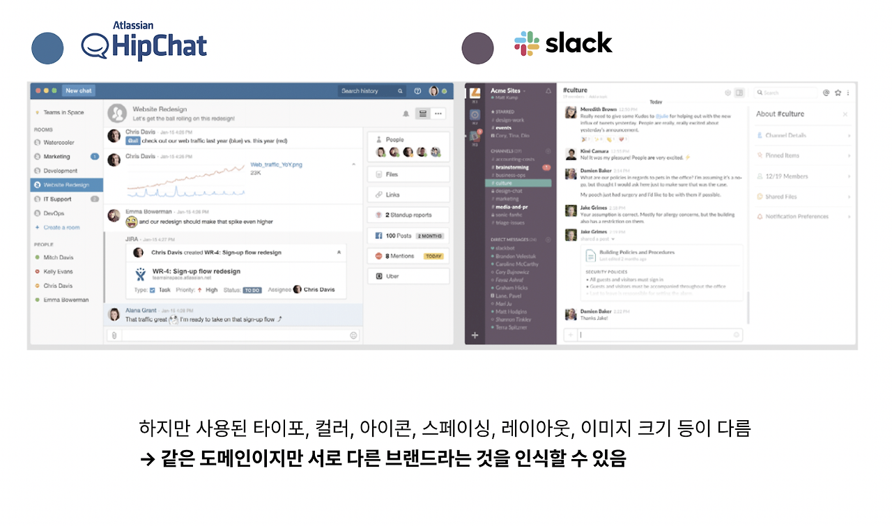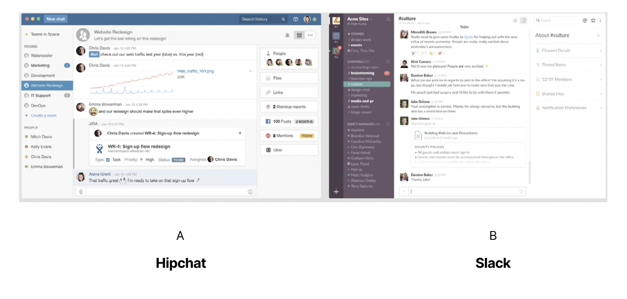 이번에도 예시를 들어보겠습니다. A는 Hipchat이라는 서비스고, B는 Slack이라는 서비스입니다. 두 서비스 모두 채널 기반 메시징 플랫폼입니다.
