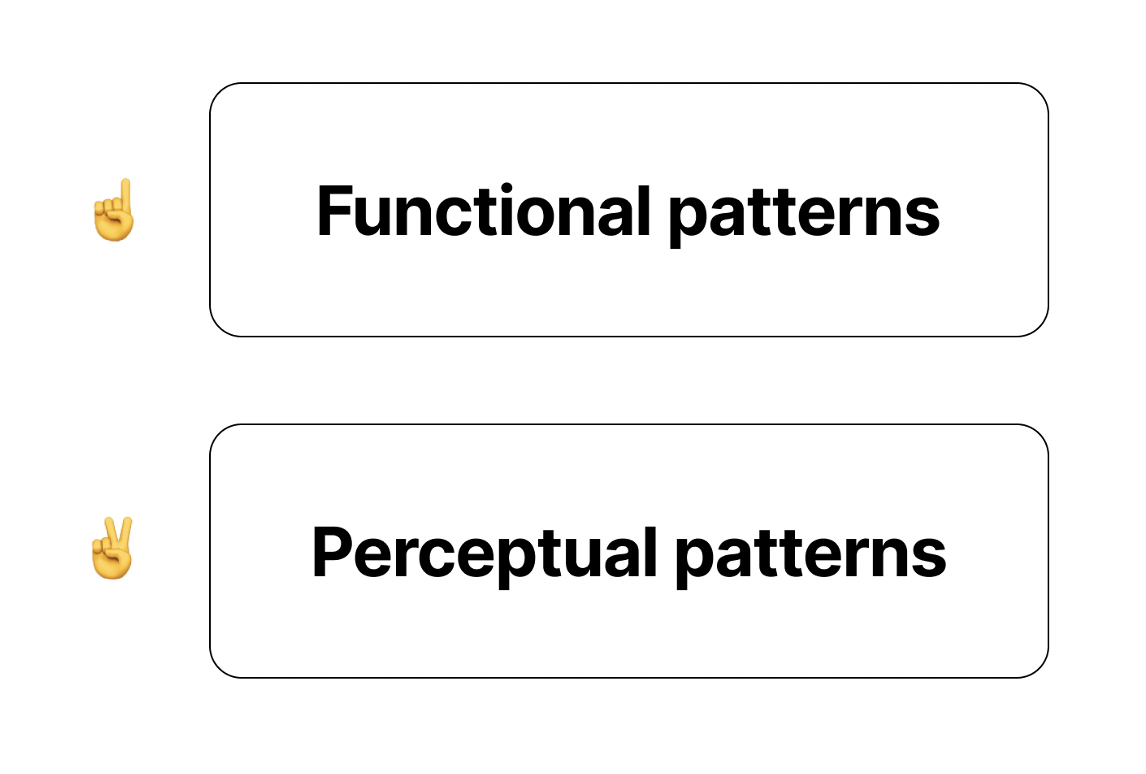첫 번째로는 펑셔널 패턴(Functional Patterns)과, 두 번째는 펄셉슈얼 패턴(Perceptual Patterns) 총 이렇게 총 2가지의 패턴을 우리는 인지하고 만들어야 하는데요.