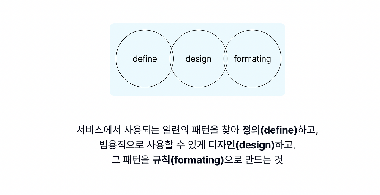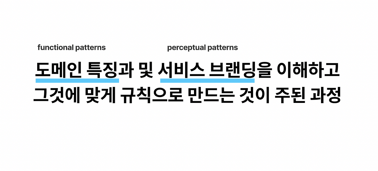 이 작업을 세 단계의 프로세스에 맞게 좀 더 풀어서 설명하자면, 서비스에서 사용되는 일련의 패턴을 찾아 정의하고 범용적으로 사용할 수 있게 디자인하고, 그 패턴을 규칙으로 만드는 것입니다. 그래서 우리는 이 ‘패턴’을 만드는 것에 집중해야 하는데요.