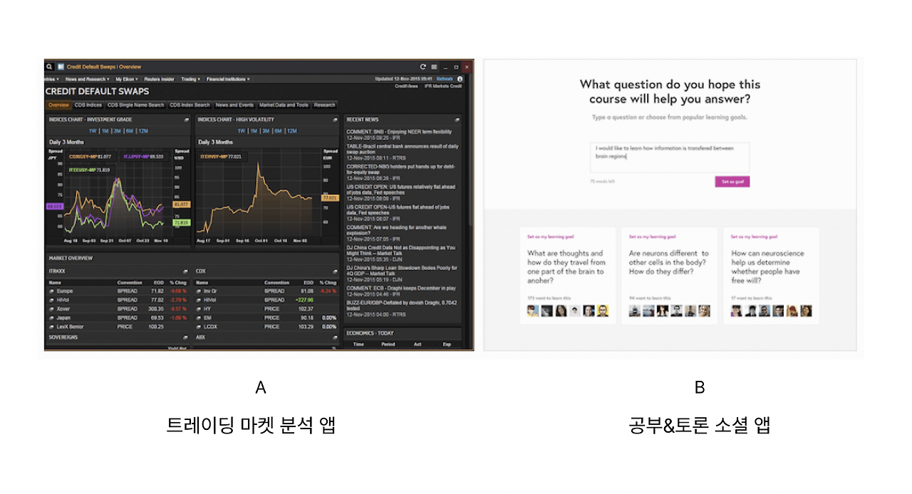 잘 모르겠으니 예를 들어보겠습니다. 왼쪽 A라는 앱은 트레이딩 마켓 분석 앱이고, 오른쪽 B라는 앱은 공부와 토론을 할 수 있는 소셜 네트워킹 앱입니다.