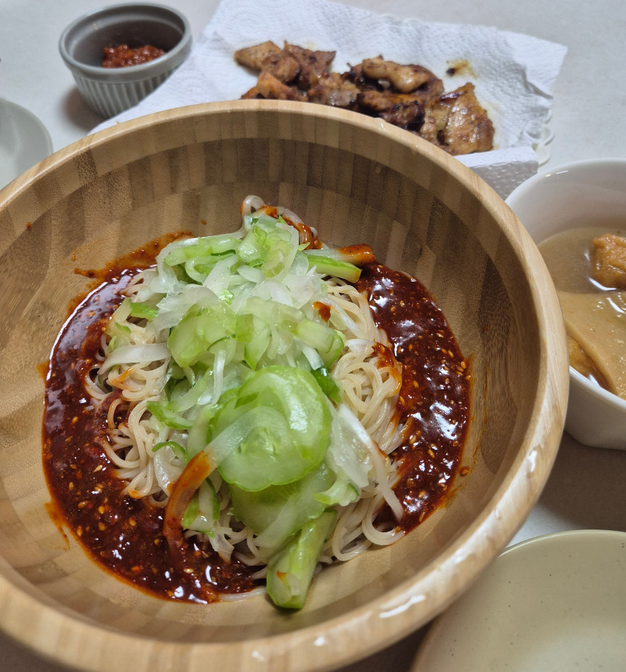 아무튼 오늘도 고기다. 고기 쩝쩝 박사들은 비빔국수와 함께 완벽한 저녁을 완성시켜 버렸다.
