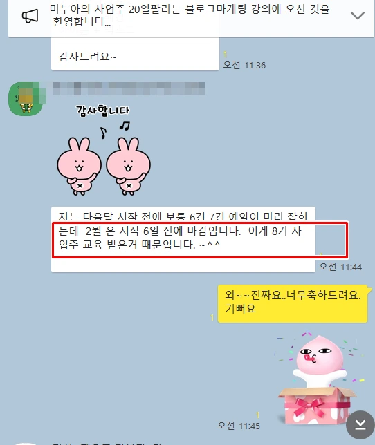 결국 그 분은 무엇이 문제일까? 고민하다 나의 강의를 듣고 13일차 되는 날 기쁜 소식을 알려주셨다. 현재 2월 한달 예약이 전체 마감이 되었다고 한다. 2월을 6일이나 앞에 두고 예약이 마감이 되었다고 하시면서. 사업주 20일 팔리는블로그마케팅 8기를 들으면서 생긴 결과라고 하시면서 이렇게 풀마감 된 적은 처음이라고 하신다.