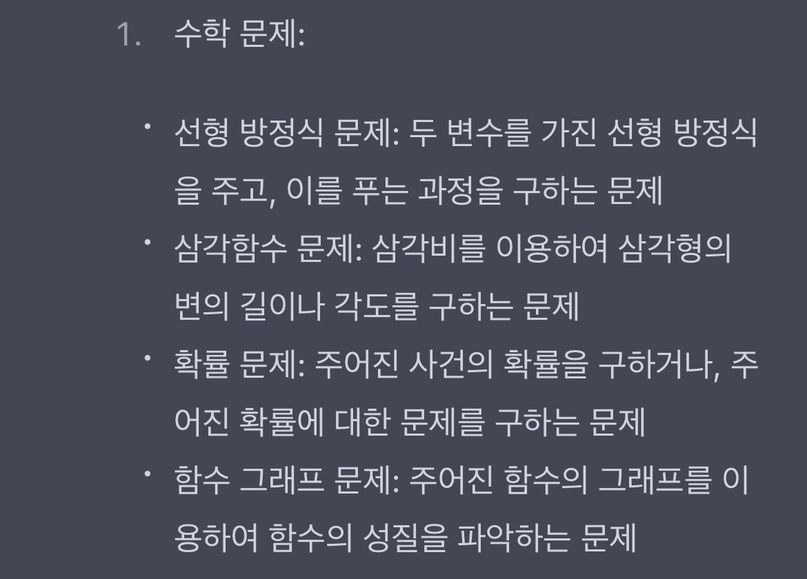 질문은 “AI를 활용하여 고1 수준의 학교에서 가르칠 문제를 뽑아달라”라고 했습니다.