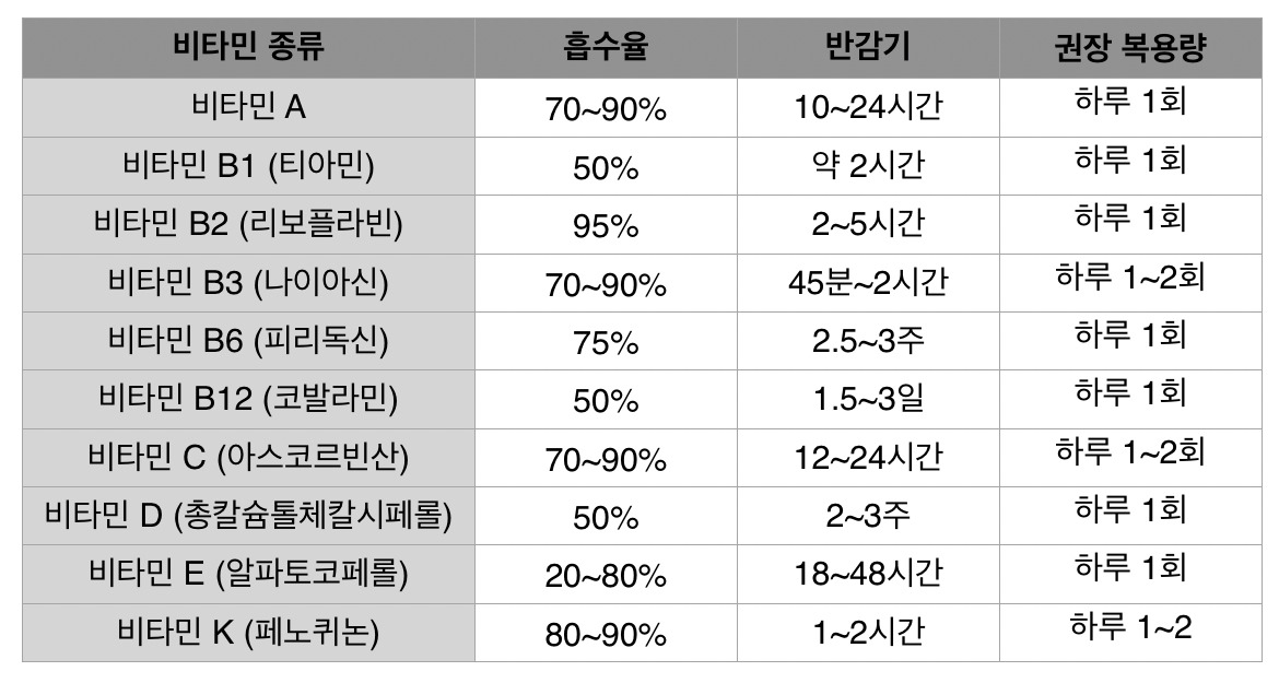 AI와 함께하는 건강 상식. 비타민, 반감기, 1일 복용량.