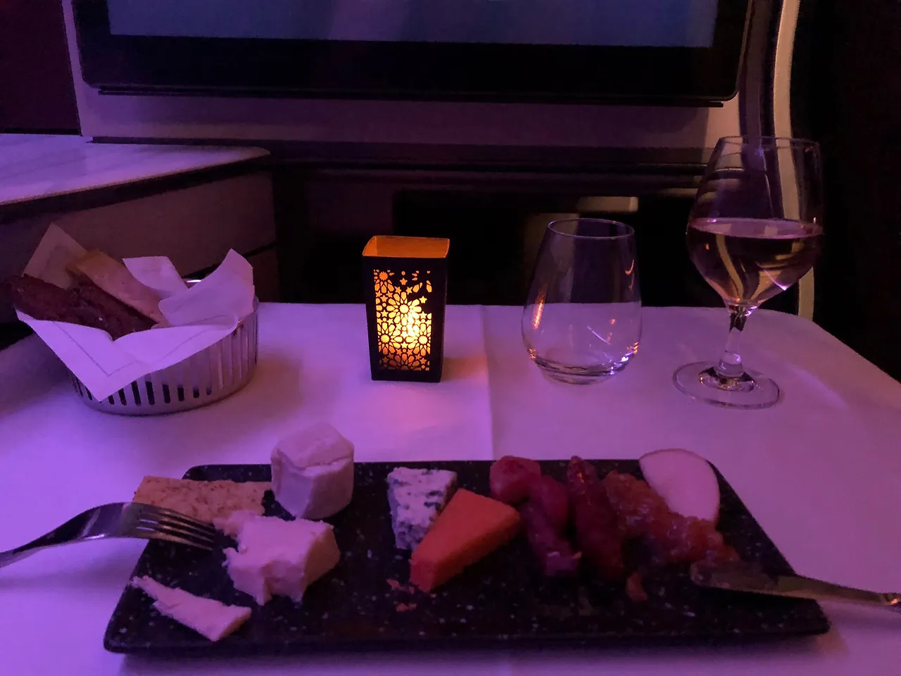 이건 지난번에 비즈니스 클래스 타고 한국 가는 길에 치즈 플레이트를 먹는 사진이다. 우리 회사는 서비스에 진심이다. 밥 먹을 때 일정 시간 이상의 구간이면 예쁜 랜턴도 켜주고 플레이팅 가이드에 따라서 손님 밥상을 아주 예쁘게 차려준다. 애피타이저는 보통 플레이팅이 다 되어서 나오는 경우가 많지만, 메인 코스 디저트는 플레이팅 가이드를 따라서 음식을 담아낸다.