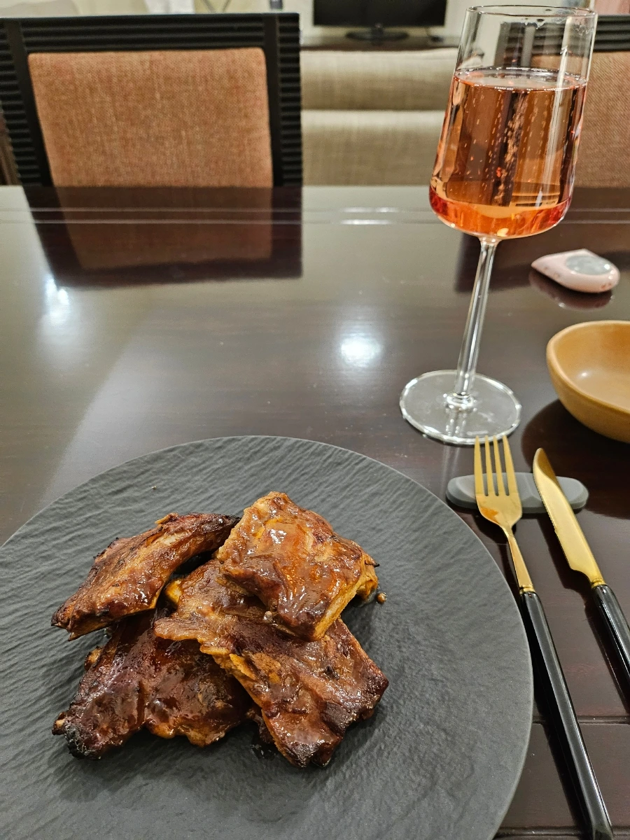 다음날에 QDC에서 폭립도 사오고 작은 스파클링 와인 한 병 사와서 축하 밥상을 차려먹었다.