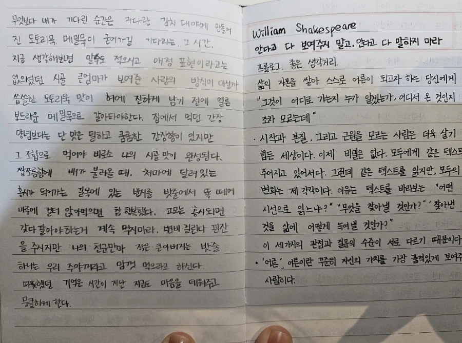 아니 웬걸, 답답했다. 좋은 글을 읽고 적고 싶은 문장을 밑줄을 긋는 것 까지는 수월했다. 진득하게 자리를 잡고 앉아서 필사를 해 나간 게 언제인지 기억이 나질 않았다. 그만큼 오랜 시간 동안 나는.. 긴 글을 손으로 적어 내려가지 않았다.