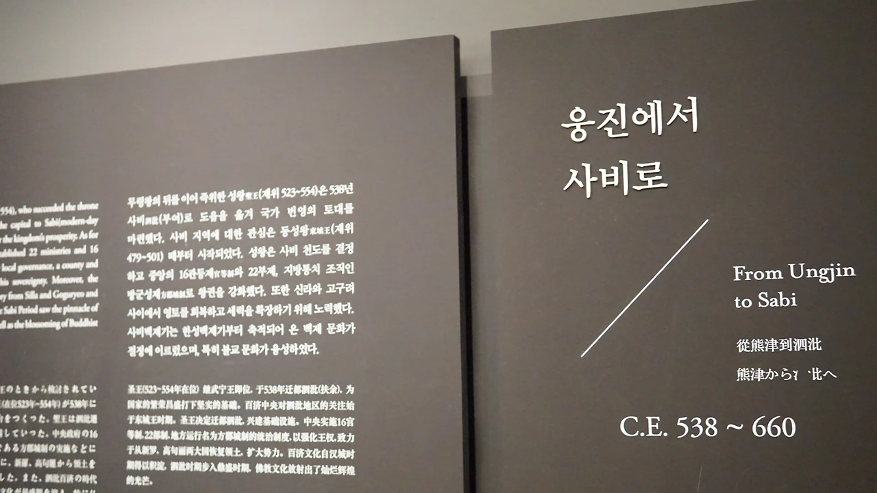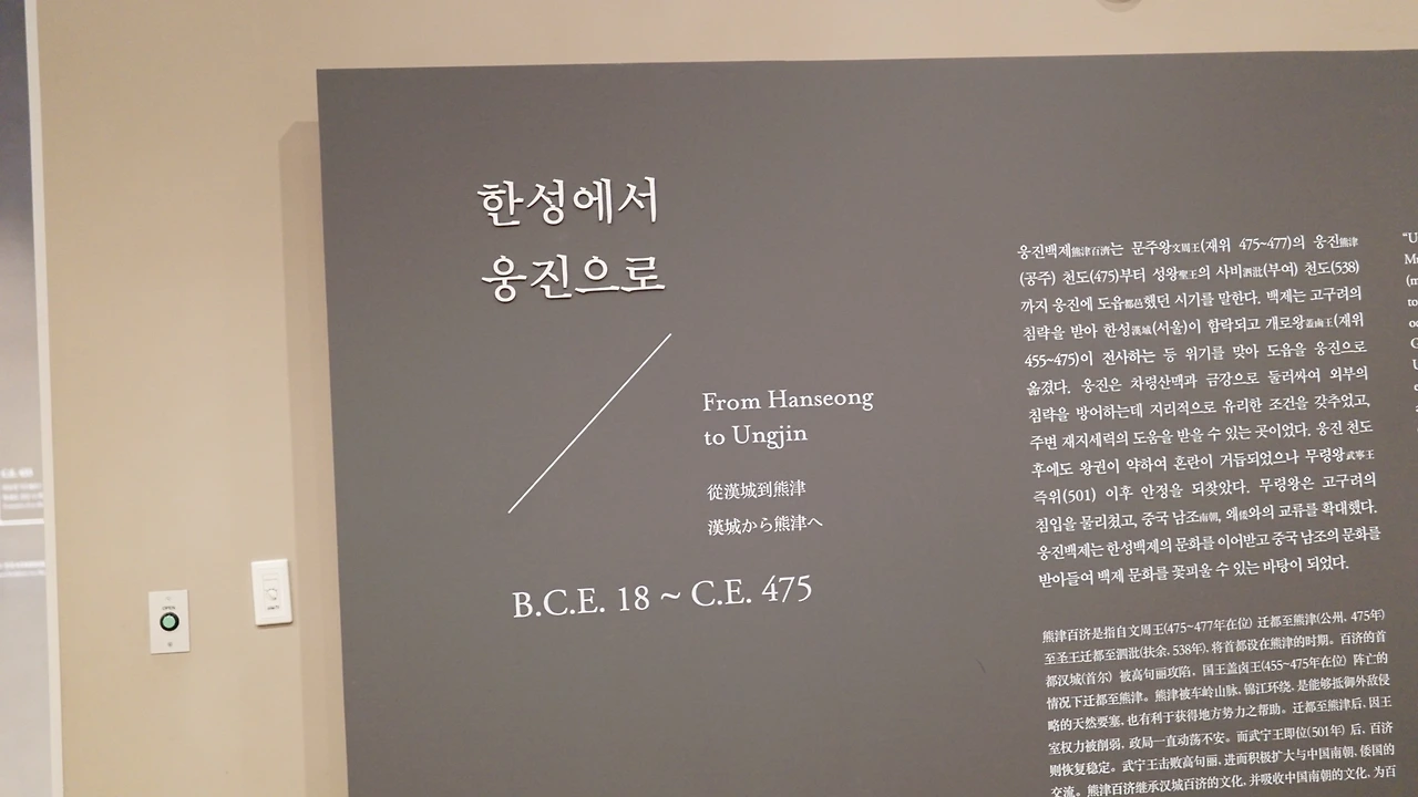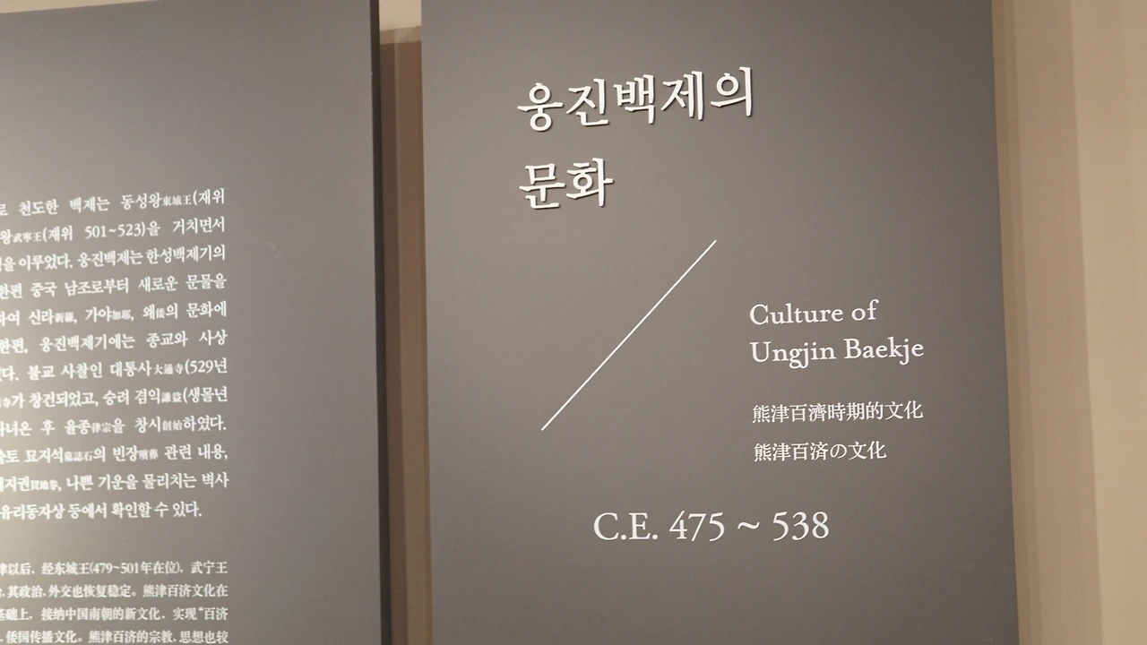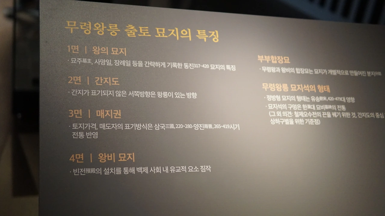 웅진백제실은 또 4개의 전시실로 나뉘는데, 1부 전시실에는 한성에서 웅진으로 옮기게 된 이유를 유추할 수 있는 여러 유물들을 전시하고, 2부에서는 웅진에서 꽃피우는 백제문화를 여러 예술품들로 증명한다. 3부는 메인 전시물인 무령왕릉 출토품 전시! 무령왕릉에서 나온 출토품들을 직접 관람할 수 있다. 이어서 4부, 웅진에서 사비로 옮기는 과정에서 꽃피우게 된 백제의 도기들을 전시했다.