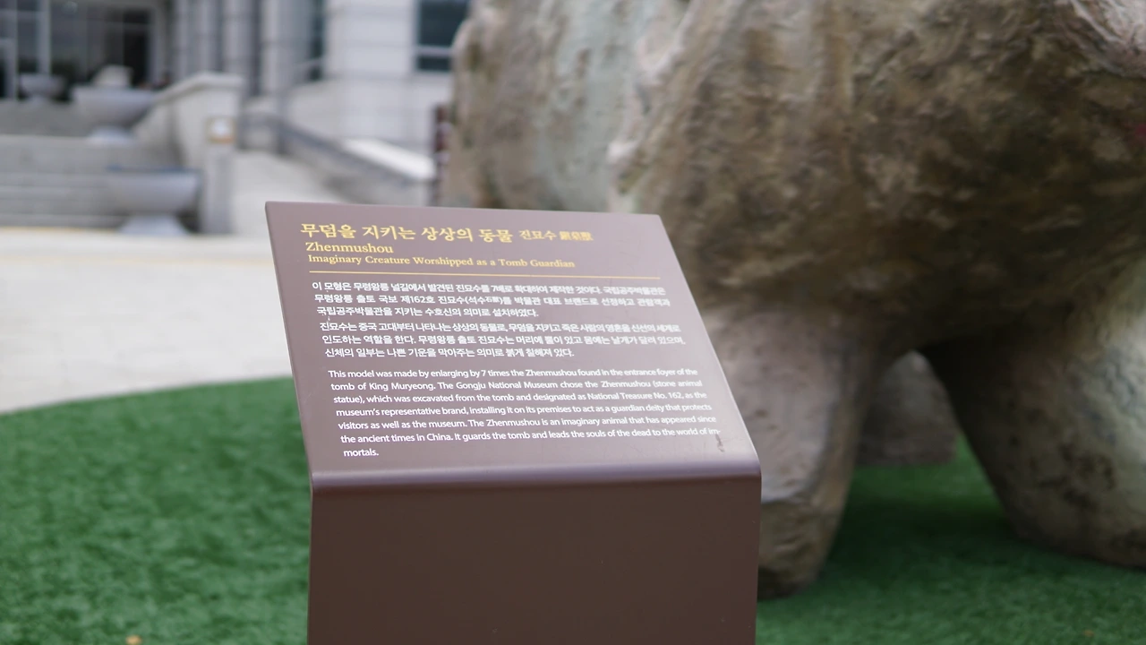 무령왕릉 널길에서 발견되었다는 진묘수(국보 162호)를 7배로 확대하여 박물관 입구에 전시해놓았다. 박물관의 수호를 염원하여 입구에 설치했다고 한다.