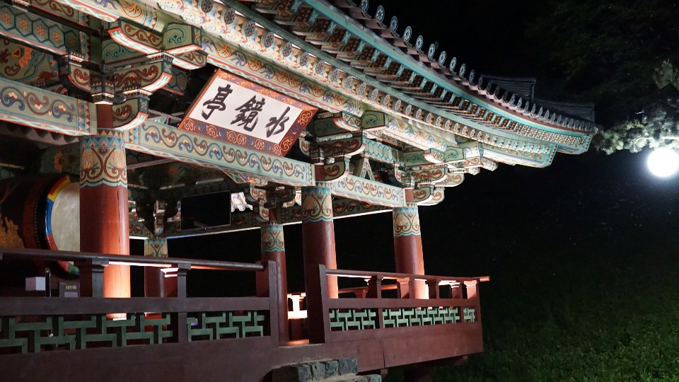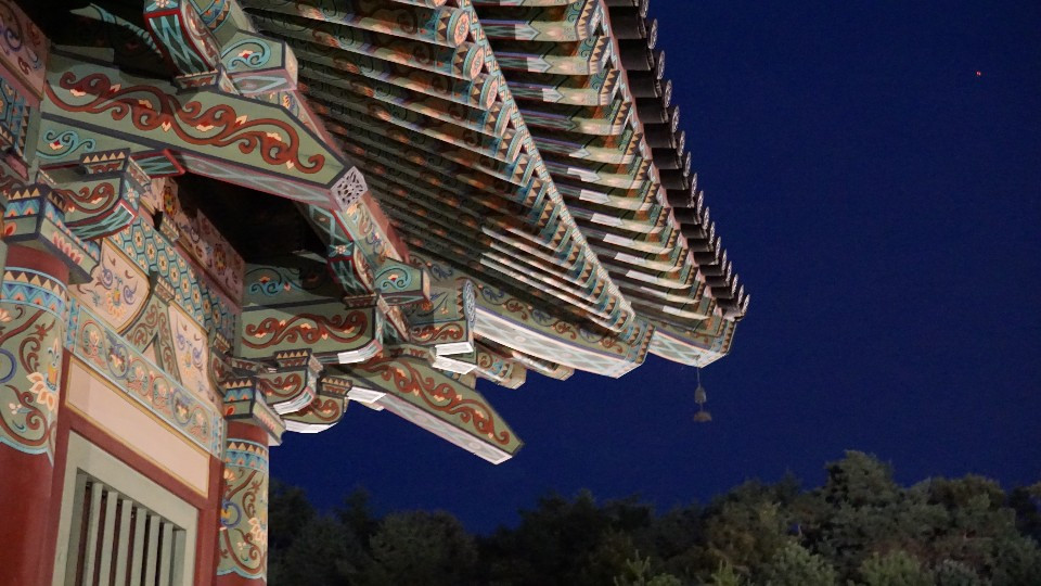수줍은 듯 구름에 숨어 은은한 빛을 뿜어내는 달, 백제의 건축물에서 흔히 볼 수 있었던 단청의 색감, 그리고 바람이 불 적마다 소리가 나는 장식물. 정말 정말 아름답지 않은가?