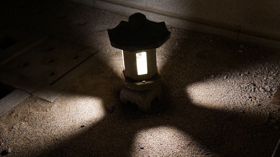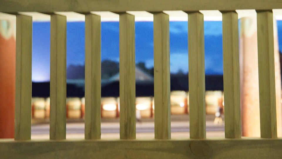 그 무늬가 돋보이도록 조명이 환하게 켜지고, 그 뒤로 감색 하늘이 너무나 잘 어울리는 것이 아닌가! 이런 조화야 말로 내가 진정 사랑하는 풍경이었다. 화려한 듯 단아하고, 예스럽고 고급스러운!