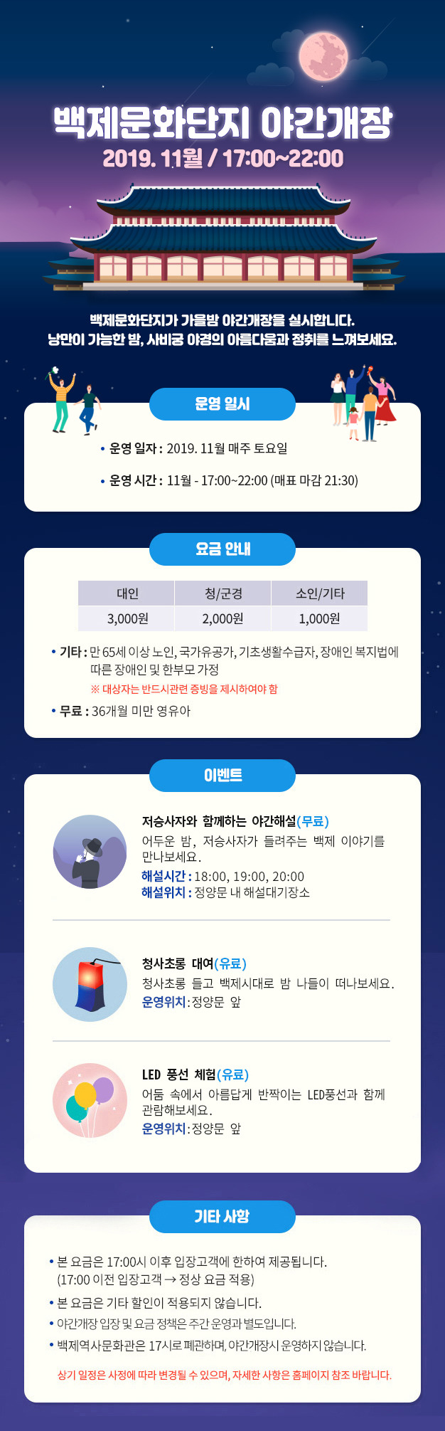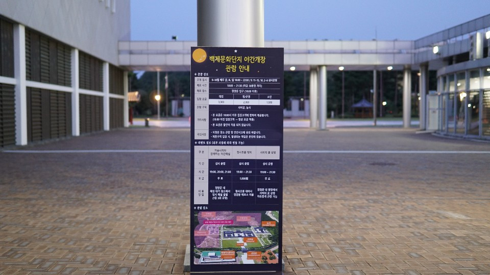 뒤에서도 한번 더 이야기하겠지만 서울의 여러 궁 야간개장처럼 이곳 백제문화단지 역시 야간개장 기간이 한정되어 있다, 이유는 명확히는 모르겠지만... 추울 땐 저녁때 입장하는 경우가 대폭 줄어들어서가 아닐까 추측해본다. 고로 12월에는 야간 입장이 전혀 불가능할 수도 있다.