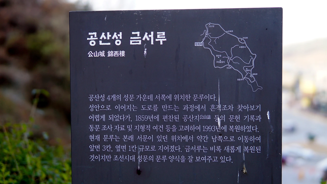 공산성에는 4개의 성문이 존재하는데, 그중에 가장 먼저 눈에 띄는 것은 성문 가운데 서쪽에 위치한 '금서루'이다. 원래는 성안으로 이어지는 도로를 만드는 과정에서 흔적을 찾기 어렵게 되었다가 1993년에 복원되었다고. 지금 지어져 있는 문루는 본래 서문이 있던 위치에서 약간 남쪽으로 이동하여 지어졌다고 한다. 아무래도 백제시대에 존재하던 유적지이다 보니 소실된 것들도 많았던 것 같다. 하기사, 조선시대 유물들도 여럿 소실되었을 텐데 백제의 유적들이 남아있기가 쉽지는 않았으리라 생각된다.