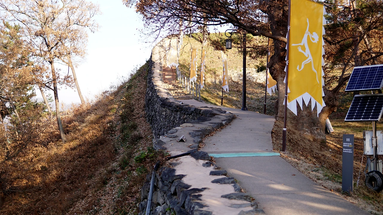 개인적으로 저렇게 백제의 분위기가 물씬 풍기는 노란색의 깃발과 길게 조성되어 있는 산성이 어우러진 게 예스럽고 좋았다. 삼국시대를 그린 사극을 보는 느낌이어서 좋았고, 마침 아침에 방문하게 되어 아침햇살이 예쁘게 내리쬐는 모습도 좋았다.
