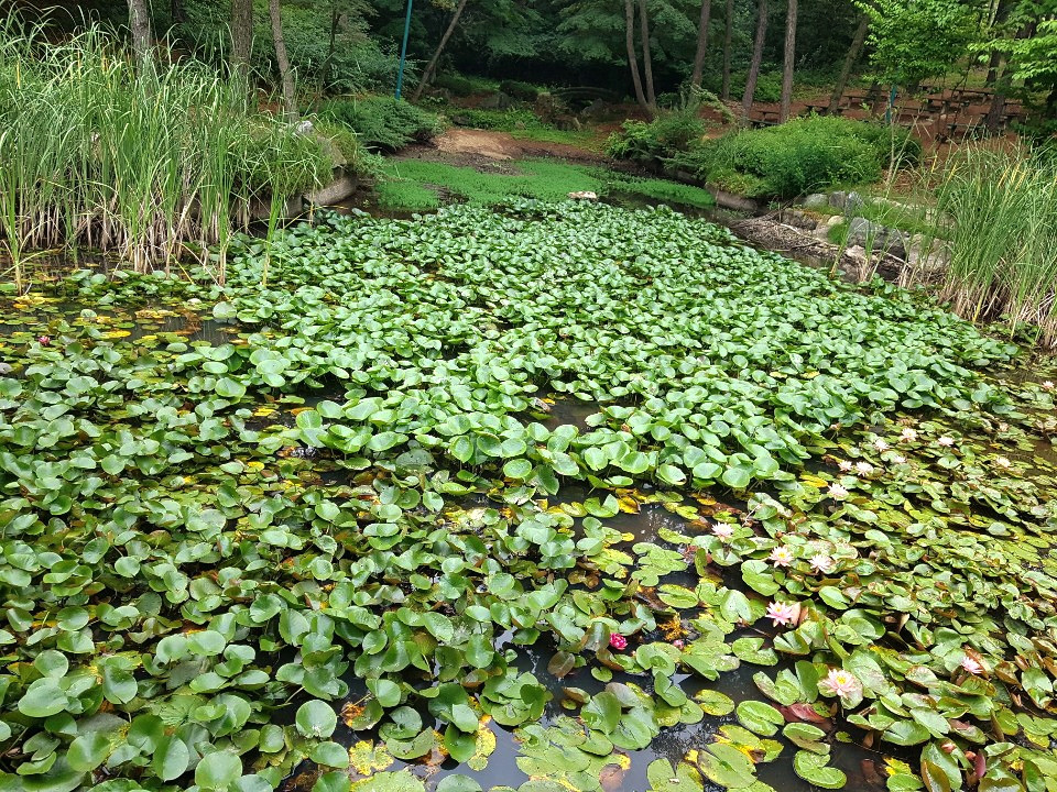 월평 녹색 나눔숲에 들어서면 생태연못을 제일 먼저 만나볼 수 있다. 곳곳에는 벤치가 설치되어 있다.