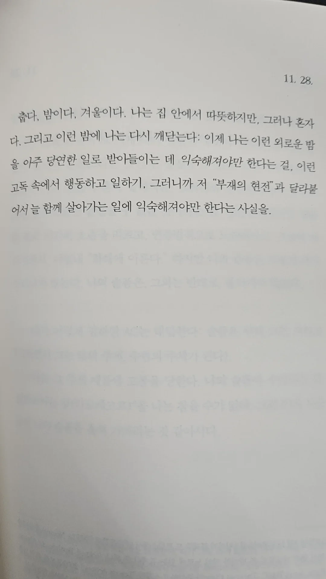 사실 롤랑 바르트라는 꾀나 비중이 큰 문예이론가의 글은 처음이다. 2차 저작에서 '텍스트론'에 관해 읽은 적 있지만, 원작은 처음이다. 그렇다고 해서 이책이 어렵지는 않다. 이론서도 아닌, 애도의 메모를 편집한 산문집이라 감정만 견뎌낸다면 쉽게 읽을 수 있다.