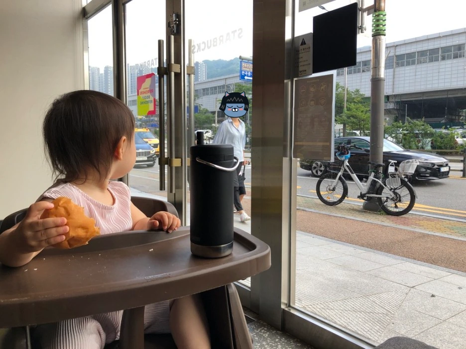집에서 도서관까지 왔다 갔다 첫 시승식을 해봤는데 , 말해 뭐해 너무 좋지. 집 근처 자전거도로를 달리니 아이가 뒤에서 "휘이이이이이 잉"하면서 좋아한다. 자전거 탈래?라고 물어보면 고개를 끄덕이며 "휘이이이이잉" 소리를 낸다. 다음에 또탈래? 물으면 또 고개를 연신 끄덕인다. 바로 그다음 날 스타벅스까지 자전거를 타고 왔고 , 대충 밖에 묶어놓고 잘 보이는 창가에 앉아서 자전거 한번 보고 아이한 번 보고.