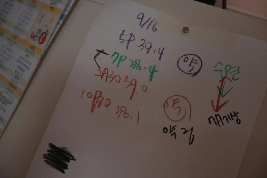 여하튼 , 아이가 오랜만 닭똥 같은 눈물을 흘리며 엉엉 울었다. 대충 손발만 씻기고 나머지는 따듯한 물수건으로 닦아주고는 어야 둥둥 안아줬다. 언제 큰 건지 이제는 번쩍 들어 안아주면 내 품에 쏙-들어오질 않는다. 남자의 진한 땀냄새도 나기 시작했고. 아이를 잘 다독여 눕히곤 체온을 쟀더니 39.4도였다.
