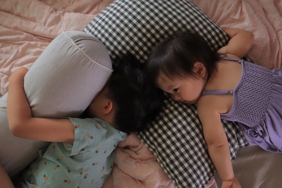 컨디션 나쁜 1호와 오빠 덕에 이것저것 맛있는 걸 잔뜩 먹어 기분 좋은 2호. 하루를 다 보내고 다시 저녁잠을 재우러 들어갔더니 아픈 아이 덕에 조금 더 다정해진 엄마가 마음에 들었는지(?) 1호와 2호가 엄청 치댄다. 양쪽에서 뽀뽀를 하고 , 내게 폭 안겨 잠이 들었다. 아 잠들기 전까지 내 얼굴도 쓰다듬어주고 날 토닥토닥해줬다.