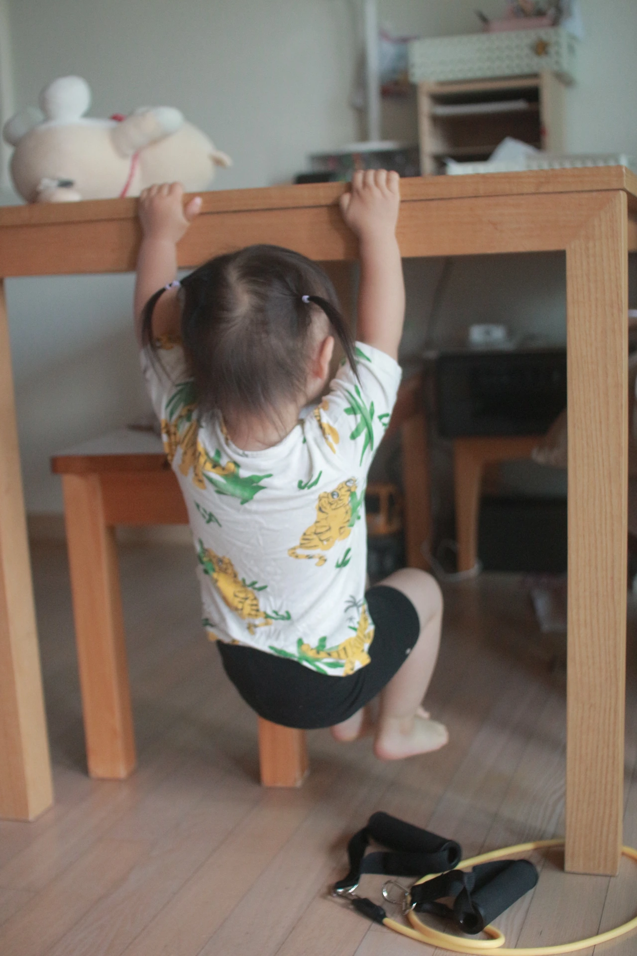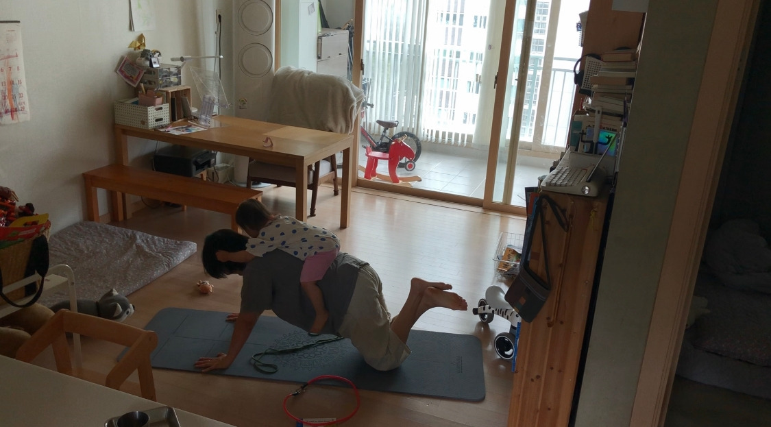정리가 끝난 거실에 요가매트를 편다. 정리가 끝난 게 확실한데 왜 거실이 이토록 지저분해 보이는지는 늘 의문이다. 여하튼 최근에 나 혼자 산다에 나온 김지훈 님을 보고 맨몸운동 덕질이 시작되었다. 올해 목표가 푸시업 정자세로 5개와 풀업 1개인데 매일 찔끔찔끔하다 보니 확실히 팔에 힘이 생겼다며 자화자찬을 하는 중이다. 내려가지 않던 몸이 절반 정도 내려가는 걸 보고 신랑이 물개 박수를 쳐주었다. 생각보다 성취감 달성에 도움이 많이 되고 있어서 우울증 치료에도 상당히 도움이 되는 것 같다. 더불어 아이들이 엄청 좋아한다. 엄마가 철봉에 대롱대롱 달려있으니 본인들도 매달려있겠다고 난리다. 보이는 것마다 매달려있는다. 그걸 구경하는 재미도 쏠쏠하고.