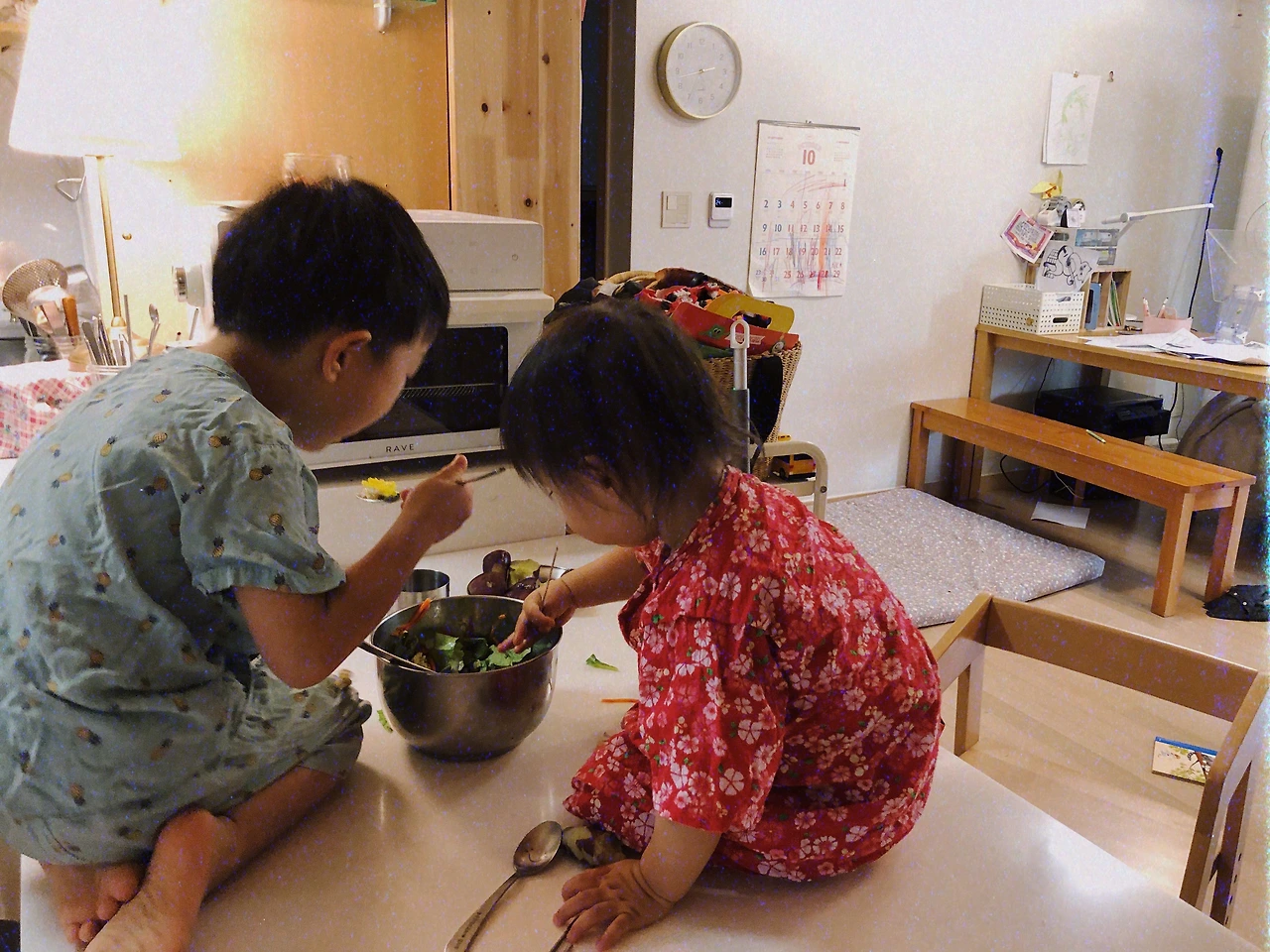 그래 비빔밥은 이 맛 아니겠니. 너희도 알아버렸구나. 에라 모르겠다 나도 숟가락 하나 들고 같이 퍼먹으려고 갔더니 이쁜 우리 아가들은 엄마 숟가락까지 준비를 해두셨다. 싹싹 양푼이 긁어먹고 설거지를 마쳤다. 설거지라고 해야 그릇 몇 개가 전부라 후다닥 마치고는 양치하고 좀 놀다가 자러 들어갔다. 아직도 아이들은 7시 무렵이면 저녁잠을 자러 들어간다. 피곤하면 바로 잠들고 그렇지 않으면 조잘조잘 이야기하다가 7시 40분 언저리로 잠이 든다.