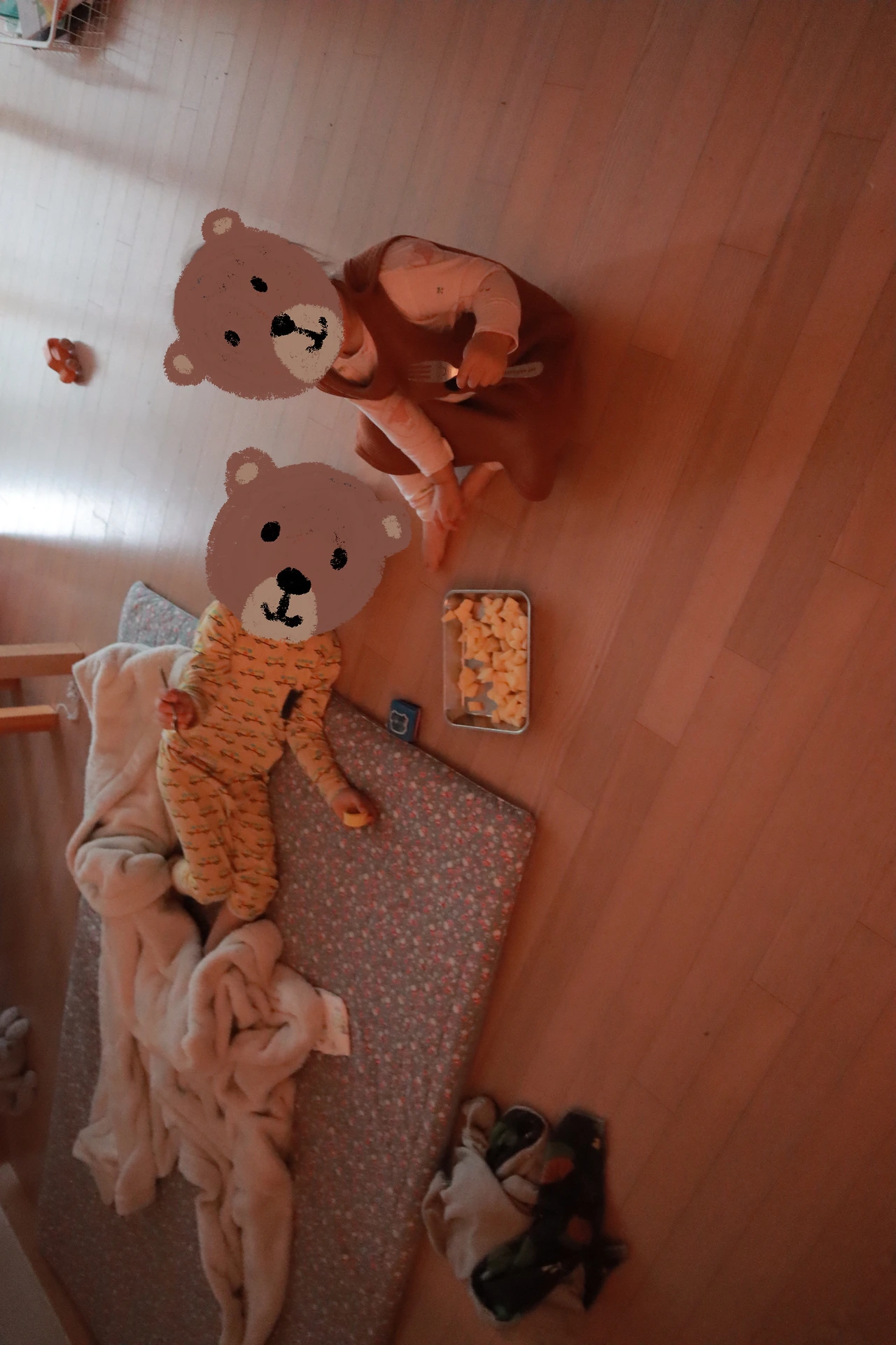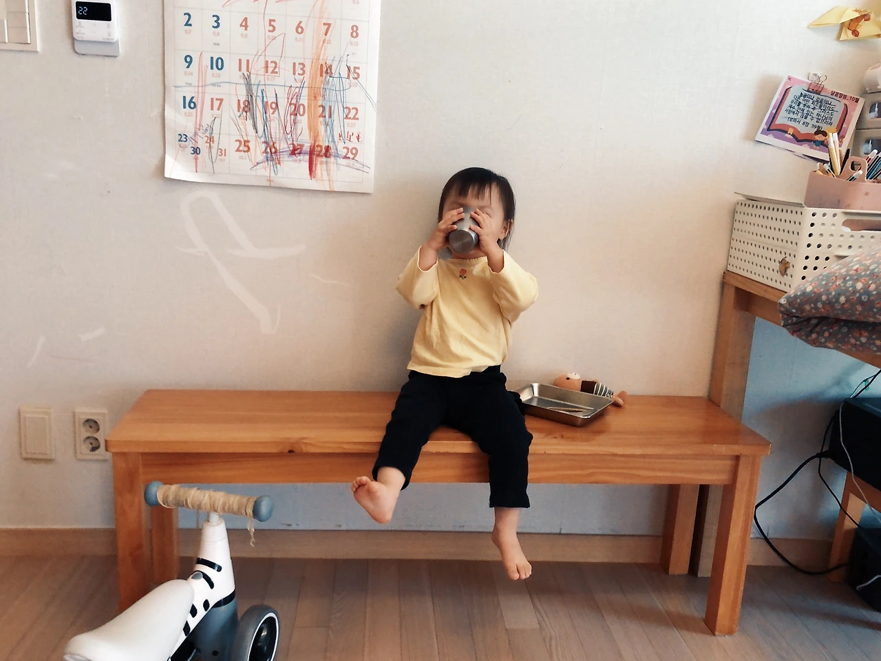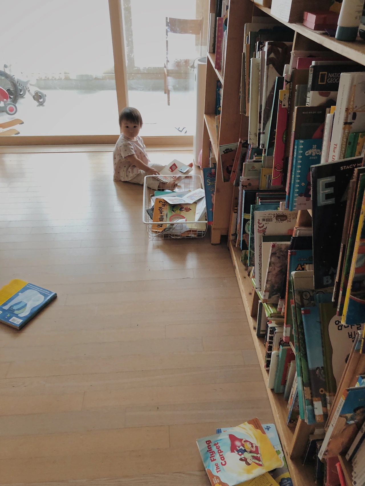 자고 일어났으니 또 간식을 드리고 (간식이라고 해야 과일이다) 전기자전거를 타러 나갈까 했는데 여기서 체력을 다 써버리면 이따 1호가 집에 돌아왔을 때 같이 못 놀아 줄 것 같아 집에서 놀기로 했다. 같이 베란다에서 지나가는 강아지랑 차구경도 하고 숨바꼭질도 하고 책상에 앉아 책도 읽었다.