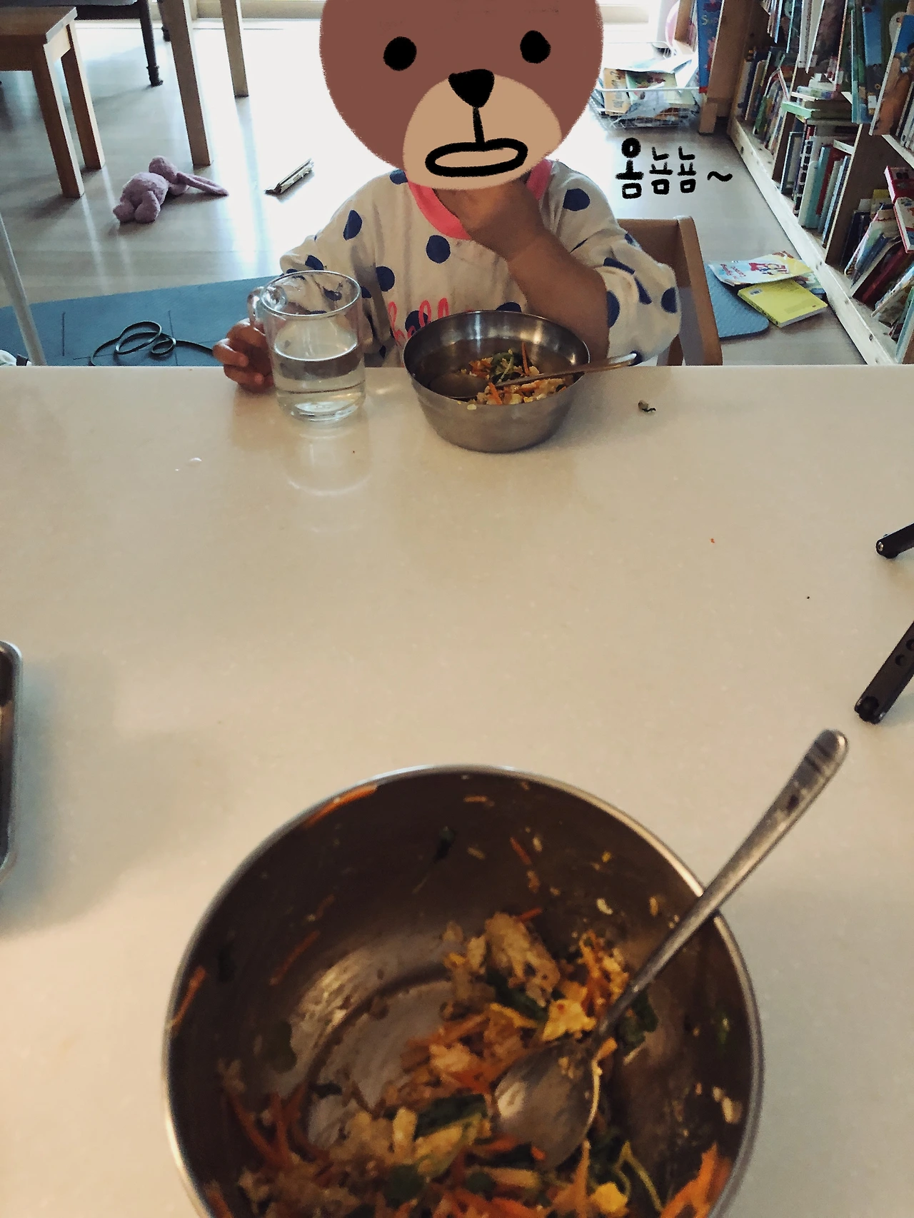 박수를 쳐주면 1호가 삐진다. 본인 가방인데 2호가 가지고 와서 엄마 칭찬을 다 받는다며.. 그럼 진작 네가 하지 그랬니. 시끌벅적한 귀가 시간이 끝나고 나면 저녁을 먹는데 오늘은 점심에도 먹었던 비빔밥을 먹기로 했다. 야채와 달걀 , 간장 , 들기름 , 밥을 넣어 주곤 둘이 비벼달라고 하니 내가 비빈다 너는 뭐냐 우당탕탕 소란스럽더니 조용해졌다. 엄마들은 알 거다. 소란스럽던 아이들이 조용해지는 순간 바로 그 정적의 순간. 그 무서움을. 이것들 무슨 사고 치나? 하고 뒤를 돌아보니 비벼달라고 주었던 비빔밥을 둘이 퍼먹고 계신다.