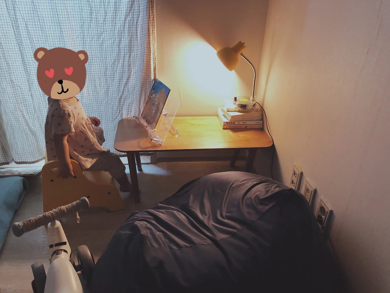 그래도 다행히 우울증 치료가 잘 되고 있는 덕에 힘을 좀 낸다면 이런 컨디션에도 아이들과 신나게 놀 수 있다. 예전엔 언감생심이었는데 흑흑. 유난히 피곤한 날이라 아이 옆에 들어가서 같이 좀 잘까 싶어서 살포시 누웠는데 방에 들어간 지 10분 이 좀 지났나? 아이가 일어났다. 이럴 수가. 보통은 엄마가 있나 확인하고 다시 잠드는데 오늘은 무슨 일인지 방문을 벌컥 열고 나가신다. 아 신난다. 못 본척하고 자는 척을 했다. 방에 돌아와서 같이 굴러다닐 줄 알았는데 거실에 있는 아이가 너무 조용하다. 조용해도 너어어어무 조용하다. 무서워서 내가 먼저 문을 박차고 나갔더니? 혼자 책을 보고 계시네. 이게 무슨 일이지.