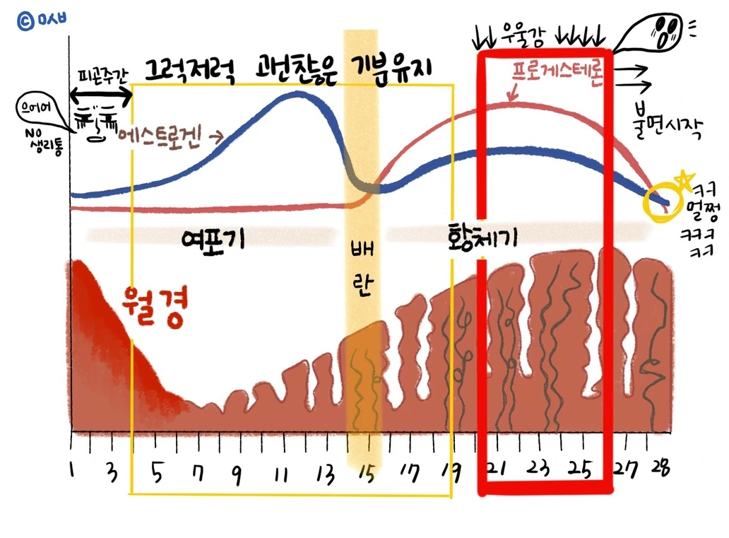여성의 생리주기에 관여하는 호르몬이 몇 가지가 있는데 내 경우에는 에스트로겐과 프로게스테론에 영향을 많이 받는 것 같았다. 에스트로겐이 지배적일 때는 그럭저럭 괜찮은 기분을 유지했고 , 배란 이후 에스트로겐이 감소하고 프로게스테론이 상승하는 시점부터 우울감이 시작되는 것 같았다. 그리고 프로게스테론이 점점 줄어드는 생리 1-3일 전에는 기분이 멀쩡 해지는 매직이 발생이 되었다. 거기에 프로게스테론이 부족하면 불면증이 생길 수 있다고 하였는데 , 그 덕분인지 기분은 멀쩡해지면서 불면증이 왔다가 생리를 시작하면서 잠을 잘 자기 시작한다.