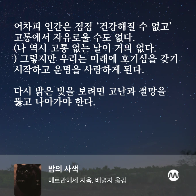 그러므로 고통을 잘 살아내는 것이 인생의 절반이다. 고통을 잘 살아내는 것이 인생 전체이다! 고통에서 힘이 생기고, 통증에서 건강이 생긴다. 갑자기 쓰러져 허망하게 죽는 사람들은 언제나 ‘건강한’ 사람들이다. 고통을 배우지 못한 사람들이다. 고통이 사람을 끈질기게 하고, 고통이 사람을 강철로 단련한다. - <밤의 사색 (헤르만 헤세 산문집)>중에