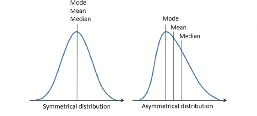 나아가 표본들의 분포 모양을 확인해야 한다. 분포 모양에 따라 대푯값들이 변하기 때문이다. 왼쪽 그림처럼 우리가 수학 시간에 배운 대칭 분포는 현실에서는 존재하지 않는다. 오른쪽으로 치우치기도 하고, 왼쪽으로 치우치기도 하고, 위로 솟아오르기도 한다. 이러한 형태를 살펴볼 때 데이터에 대한 정확한 이해가 깊어진다.