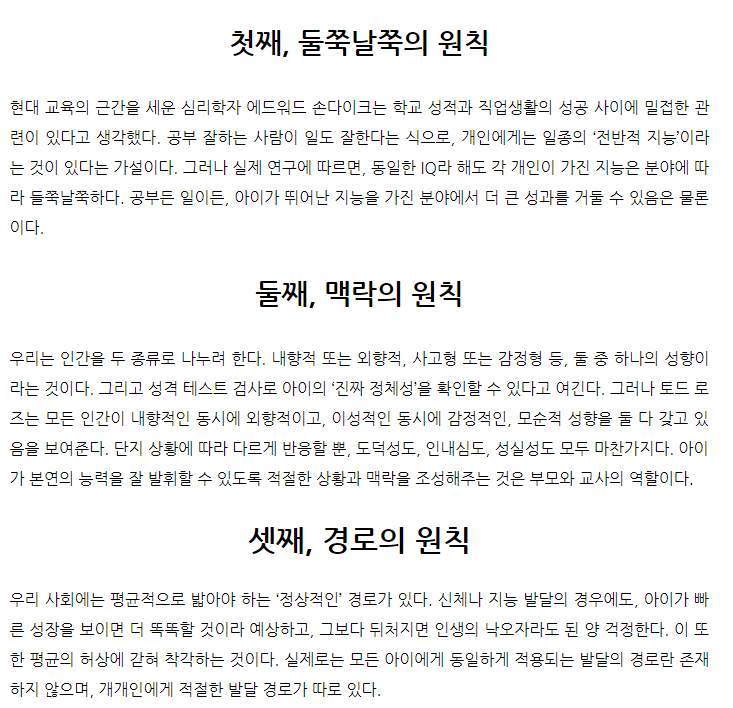 저자는 평균주의에서 벗어나 개인의 잠재력을 올바르게 평가하기 위해서는 세 가지의 개개인성 원칙을 제시한다. 첫째, 들쭉날쭉의 원칙이다. 둘째, 맥락의 원칙, 셋째 경로의 원칙이다.