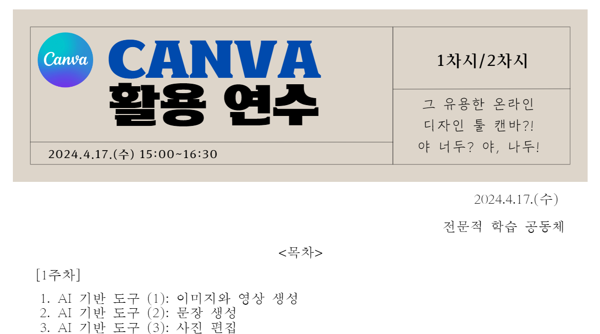 올해는 캔바 관련된 연수를 담당했다. 1차시에는 기본적인 캔바 사용법과 AI를 활용한 미지와 영상 생성, 문장 생성, 사진 편집을 소개했다. 2차시에는 학생 개인과제 및 모둠 과제를 소개했다. 개인별로 포스터, 인스타그램 게시물을 만드는 활동을 하고, 모둠별로는 PPT 만들기, 화이트보드를 활용한 협업 과제를 소개했다.