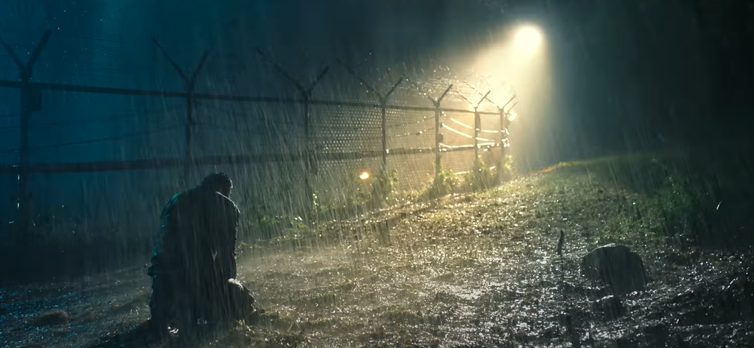 출처: 플러스엠 엔터테인먼트 <탈주(2024)> 예고편규남과 동혁의 탈주가 시작되어 군사분계선까지 이르렀다. 비가 억수로 쏟아지는 밤, 그들을 쫓아온 현상은 초소에 올라 그들을 향해 총을 겨눈다. 현상이 있는 초소는 경계 조명으로 인해 밝고 높았지만, 규남과 동혁이 있는 곳은 진흙투성이 바닥이었다. 신분과 운명이 시각화된 장소에서 동혁은 결국 총에 맞아 죽는다. 규남은 동혁과의 약속을 지키기 위해 자신을 비추고 감시하는 경계등을 모두 쏴버린다. 마치 자신을 감시하는 세력에 대한 저항의식이 서려있는 듯했다.