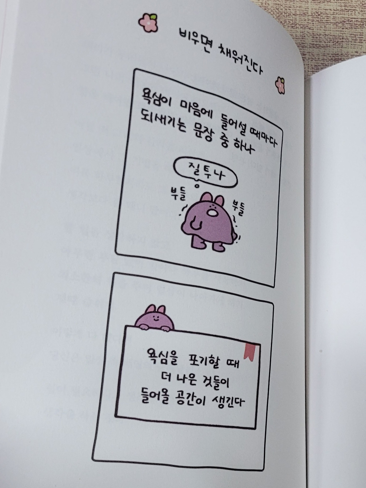 욕심을 포기하면 나는 지는 사람이 되고 도태되는 사람이 되는 게 아닌지, 자꾸만 생각을 거듭하게 하는 문장이다. 넘어지고 다시 일어서는 시간들 속에 느끼곤 했던 감정의 실체를 확인하며 마음이 가뿐해진다. '욕심을 포기할 때 내 삶은 나를 더 풍요롭게 하는 감정들로 채워진다.'라는 문장이 마음의 다이어트를 해보라고 부추긴다.