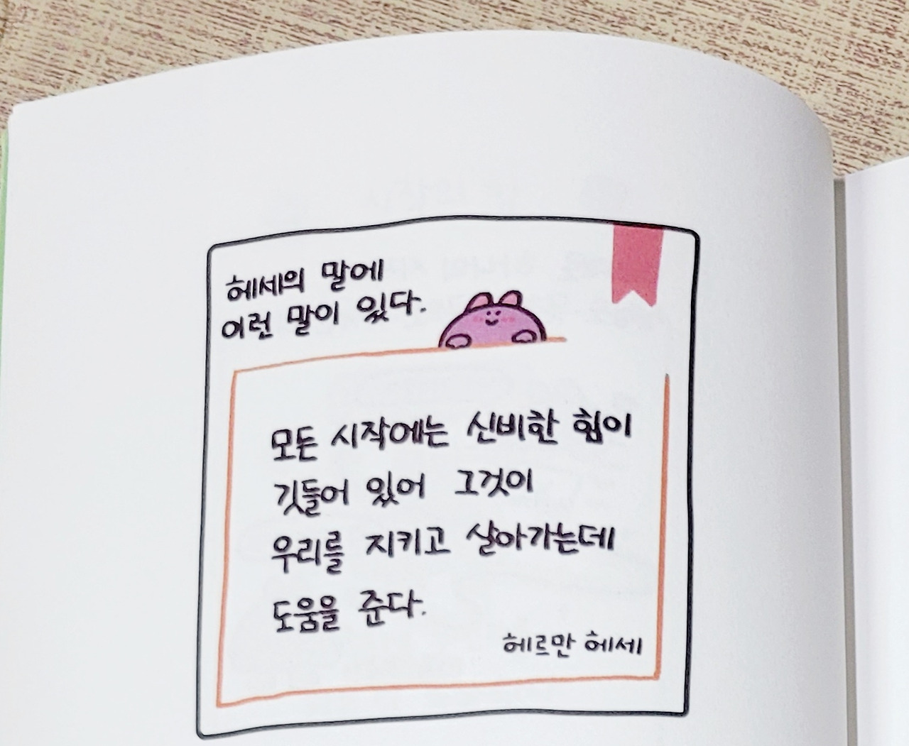 저자는 애정하는 헤르만 헤세의 문장을 마음속으로 되새기며 한 발자국 나아간다고 한다. 자신에게 커다란 힘을 주고 또 단단한 믿음이 되어 주고 있는 문장을 선물한다. '모든 시작에는 알 수 없는 힘이 있다'라고 말한 헤르만 헤세의 문장을 비롯해, '요즘 시작할까 말까 고민하는 일이 있다면 '당장 해 보자'라고 응원하는 저자의 글에서 힘이 난다.